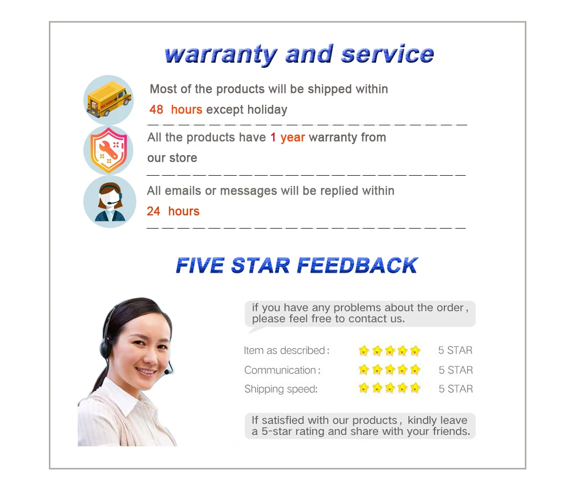 2. Для того, чтобы предоставить вам лучшее обслуживание, пожалуйста, относитесь к сделке честно. Прежде чем оставить нейтральный или отрицательный отзывы, или у вас есть какие-либо вопросы о наших продуктах, пожалуйста, свяжитесь с нами, чтобы получить лучшее решение.