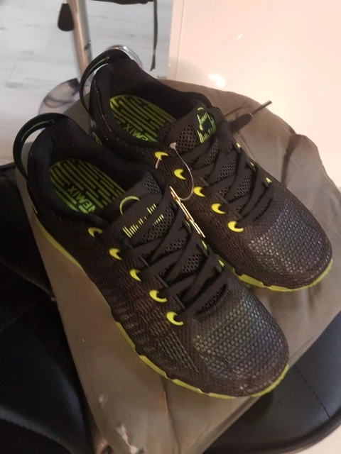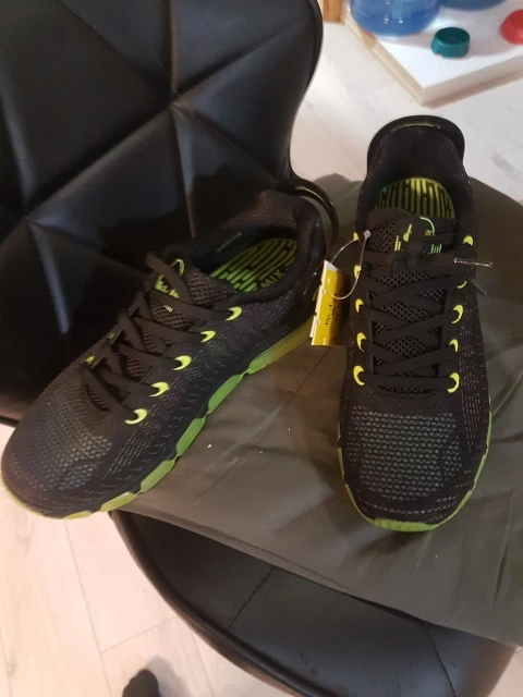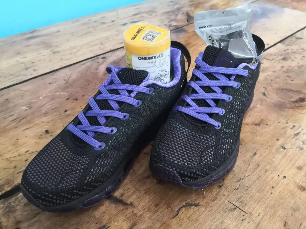 Llegaron muy rápido y las zapatillas, como otras que tengo de onemix, me parece que están muy bien hechas, vienen con cámara de aire, son negras pero con un fondo varía el colorido en función de la luz, y la suela es verde amarillenta. La numeración es la que no veo acorde con la europea, el 10 para un 44 es pequeño, incluso yo diría que equivaldría a un 43 justo. Es lo que me pasó con las anteriores que compré. En estas he comprado un 11, que equivalen a un 45, y quizá sean un pelín grandes para mí. En teoría yo uso un 43-44.