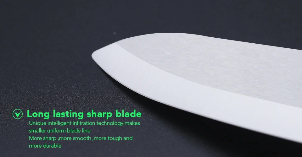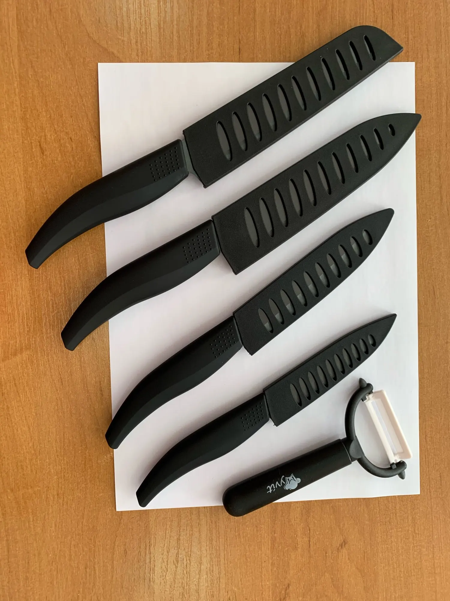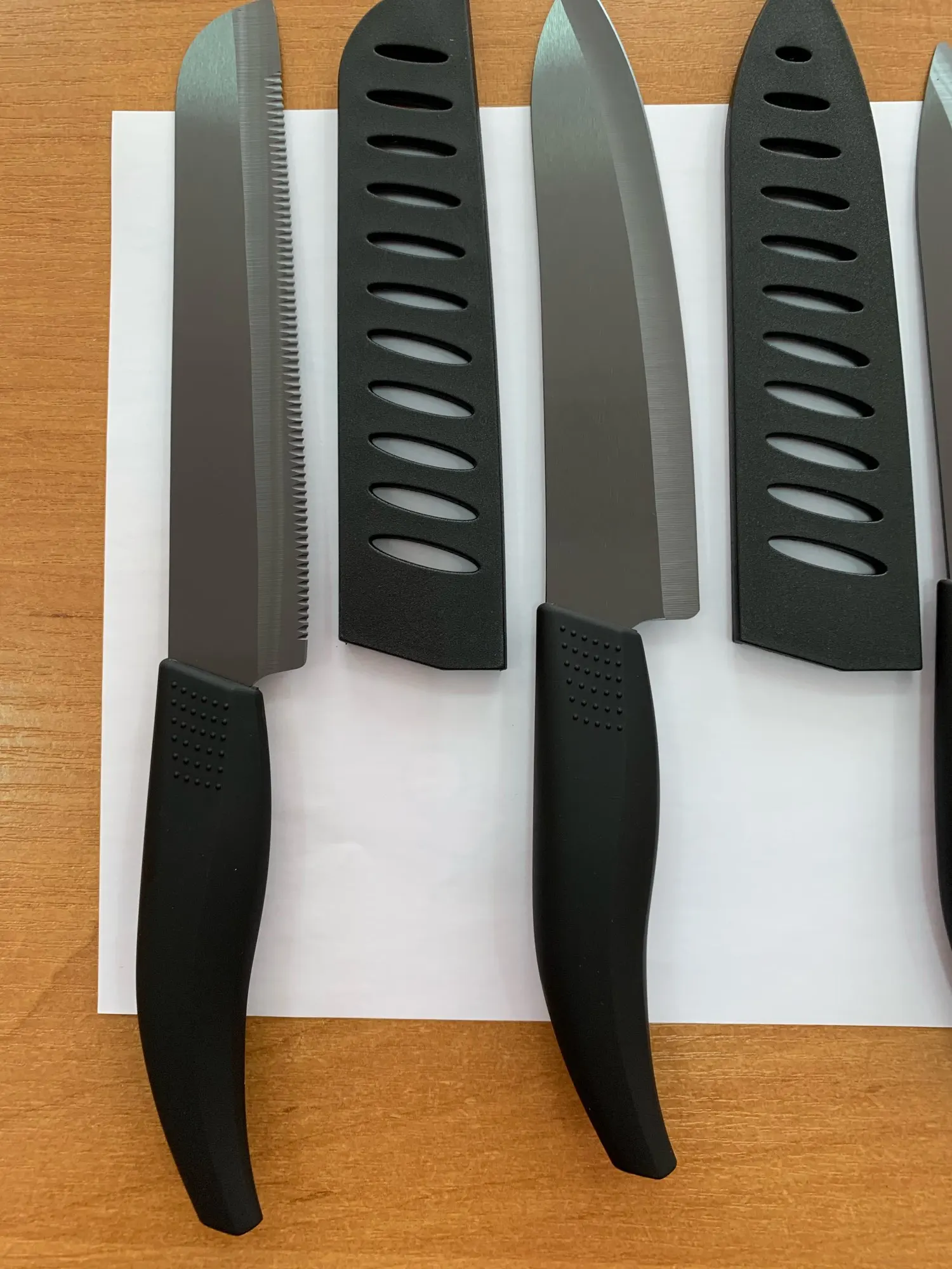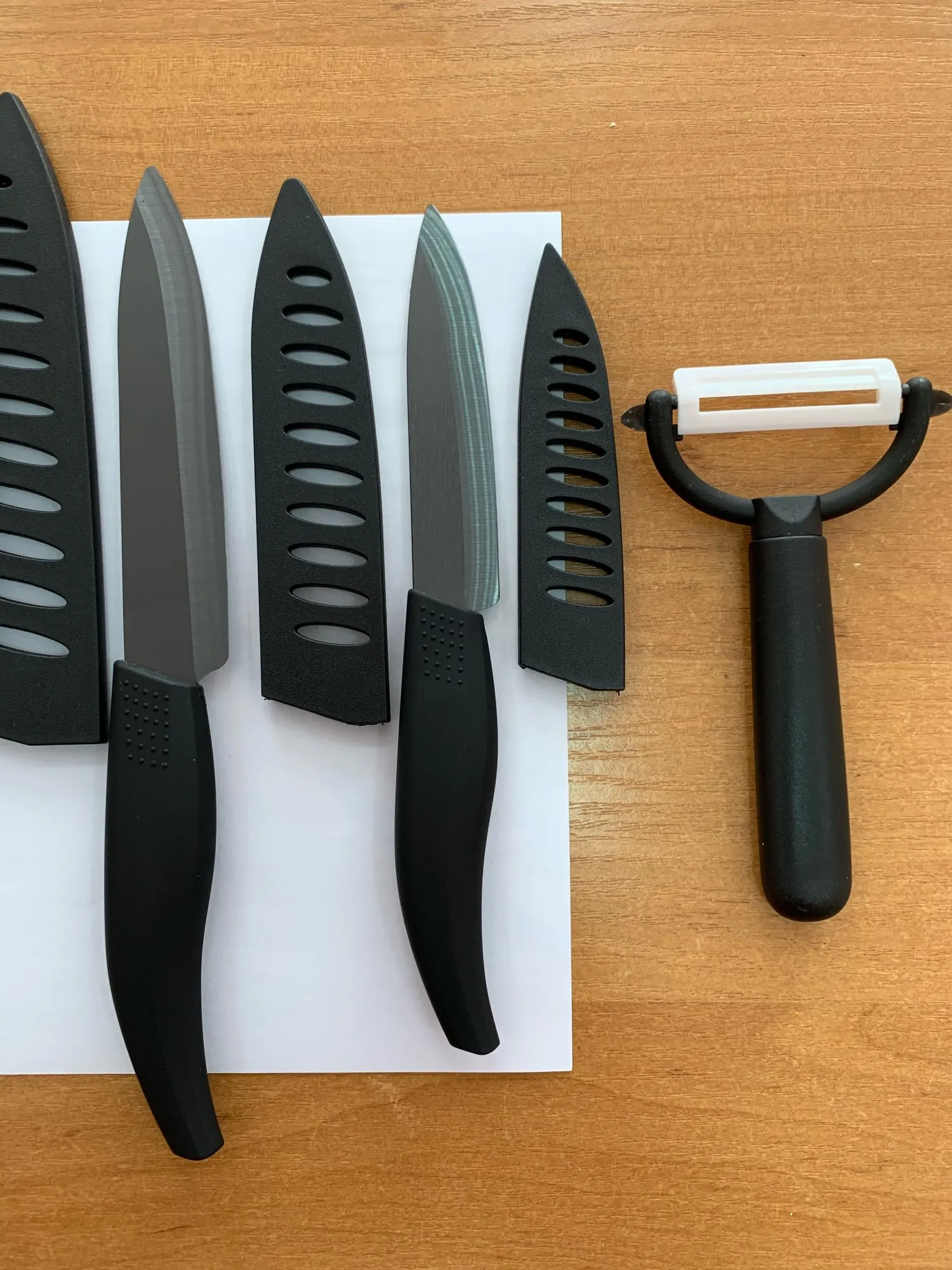 Ножи не керамические, а стальные, которые выглядят как керамические. Это означает, что это не то, что ожидалось. Они могут быть согнуты, а Керамика не может быть согнута. Кроме того, при более высоком увеличением можно увидеть металлическую шлифовку для заточки. Относительно долгое время ожидания 6 недель. Ян