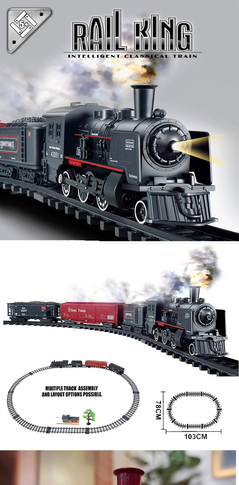 классный поезд! реалистичный звук, пар. Поехал, правда, только с дорогими батарейками, новые дешёвые оказались недостаточно мощными (сработал только звук, пар и свет).