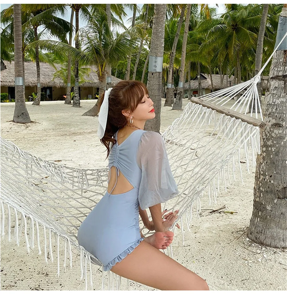 Женский Цельный купальник с пышными рукавами, однотонный купальник,...