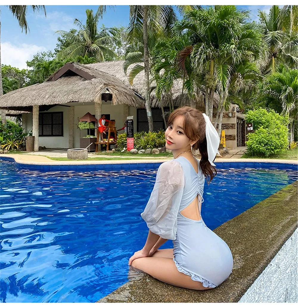 Цельный купальник с длинным рукавом, Женская однотонная одежда для плавания, кружевное Монокини, купальник с высоким вырезом, купальный костюм с рюшами, пуш-ап, с открытой спиной