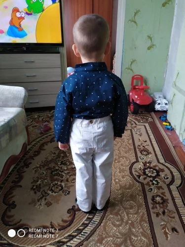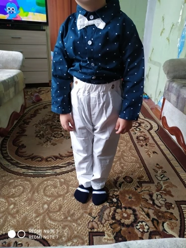 Нам подошло на размер 92, 14 кг в притык. Взяла для фотосессии на др. Бабочка пришита к рубашке. Отпорола и купила на резинке более аккуратную тоже белого цвета. Брюки и рубашка класс. Ткань приятная. После стирки не села и не покрасилась