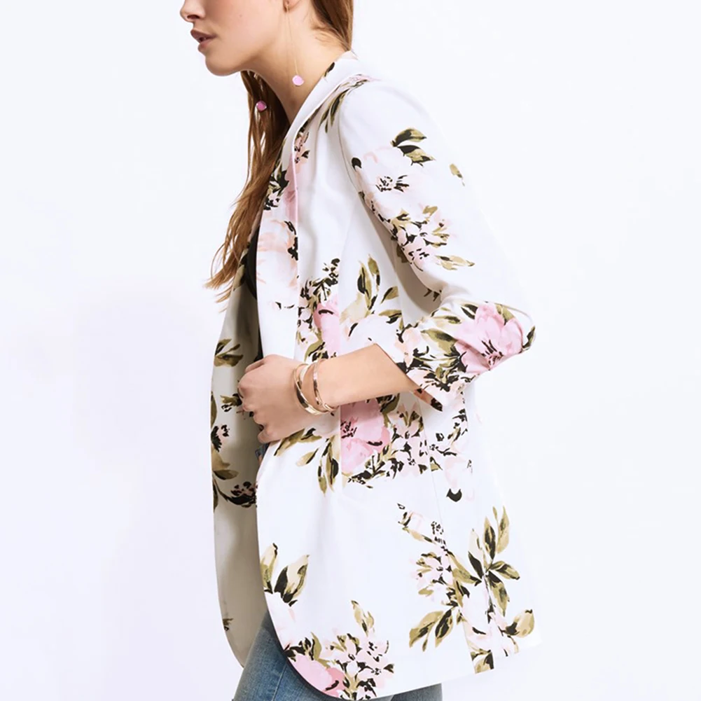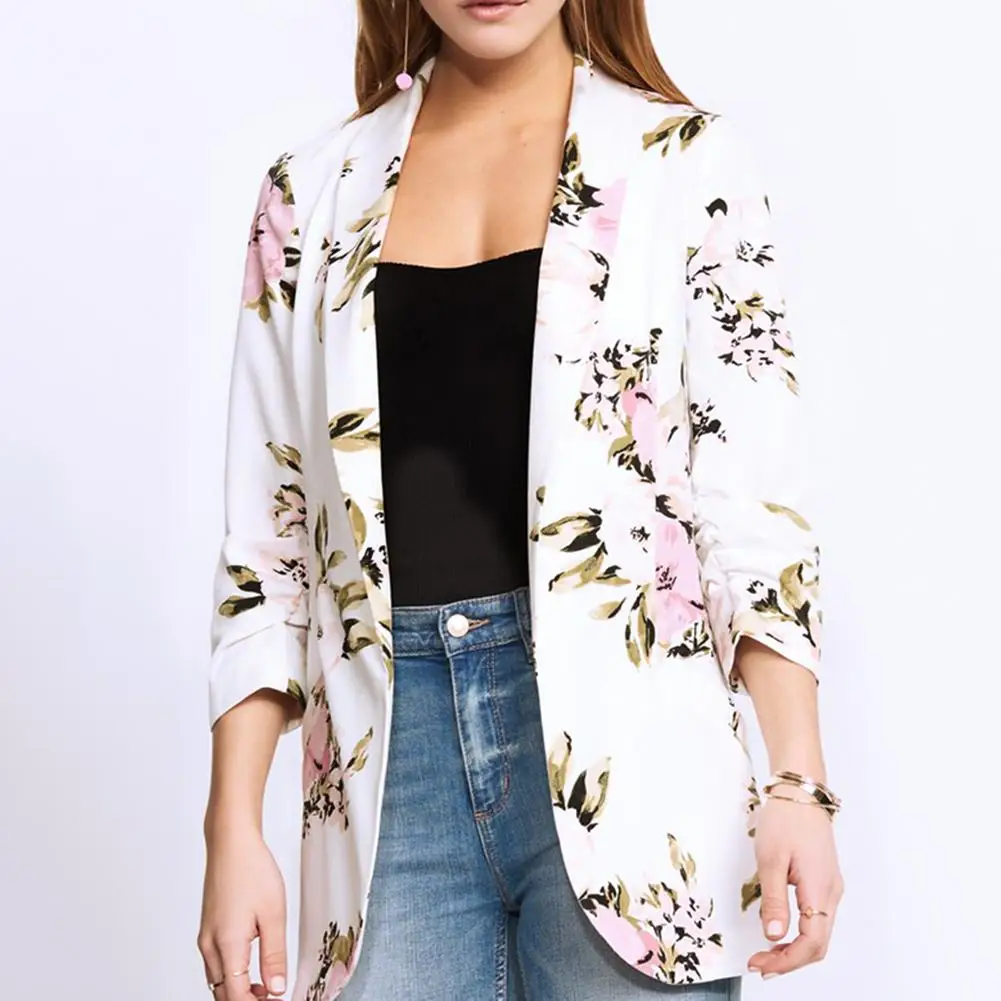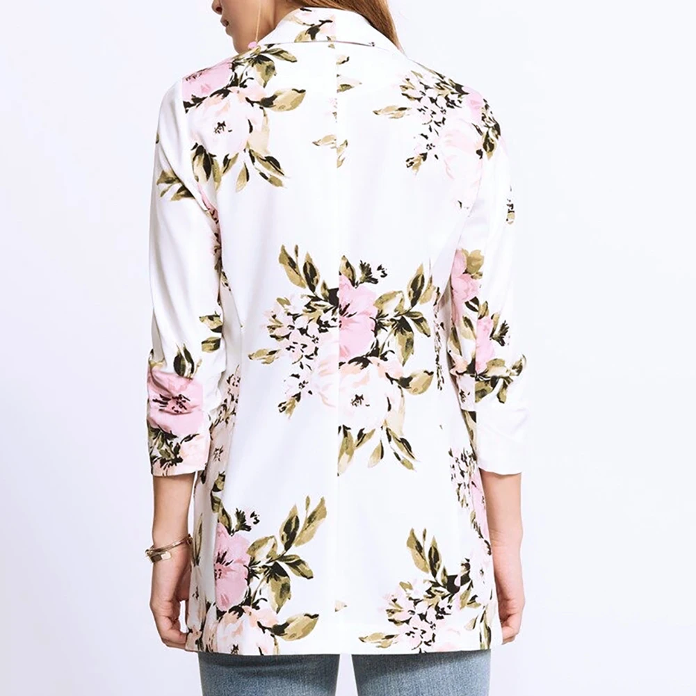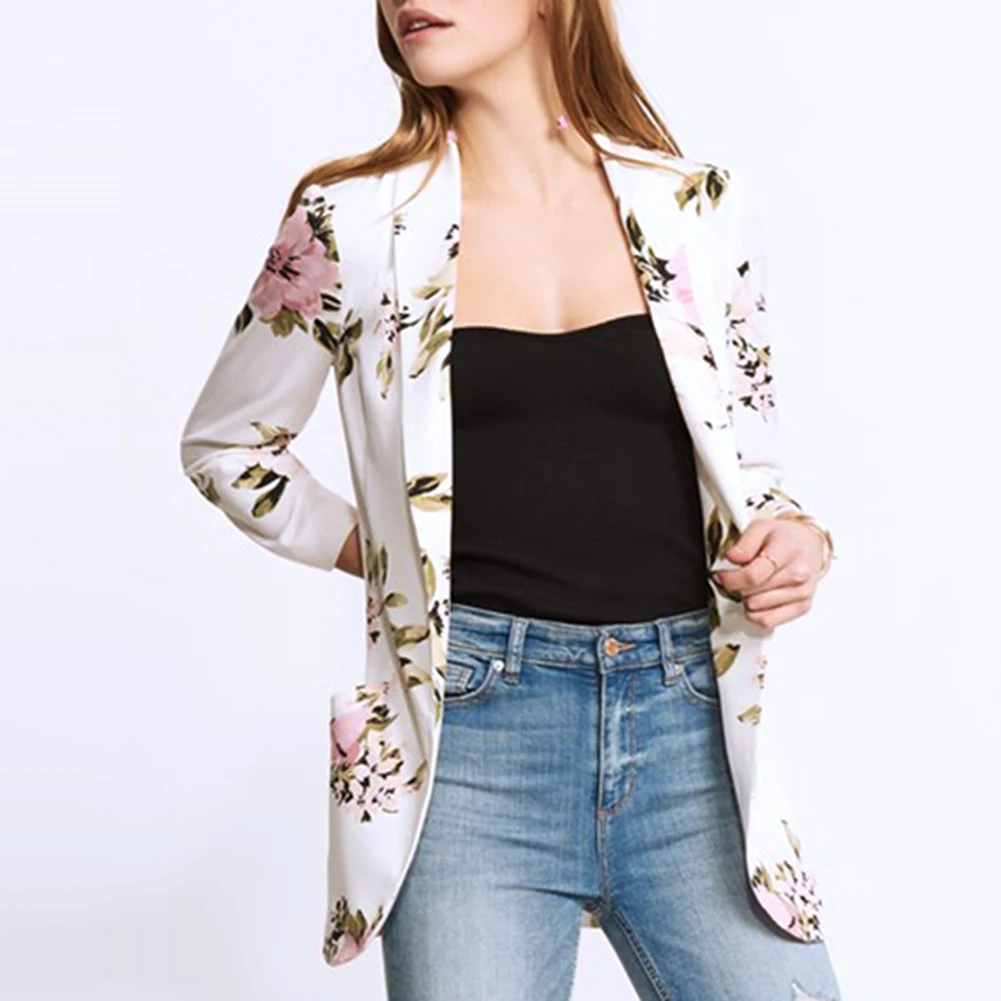 Женский офисный приталенный Блейзер с цветочным принтом, пиджак с длинным рукавом и открытым передним карманом, облегающий деловой пиджак, модное женское пальто
