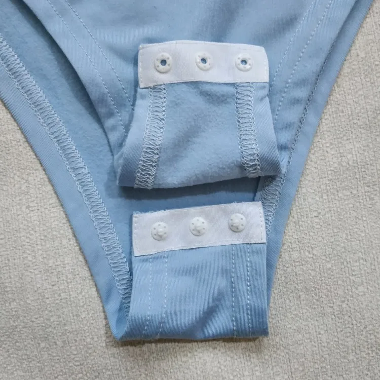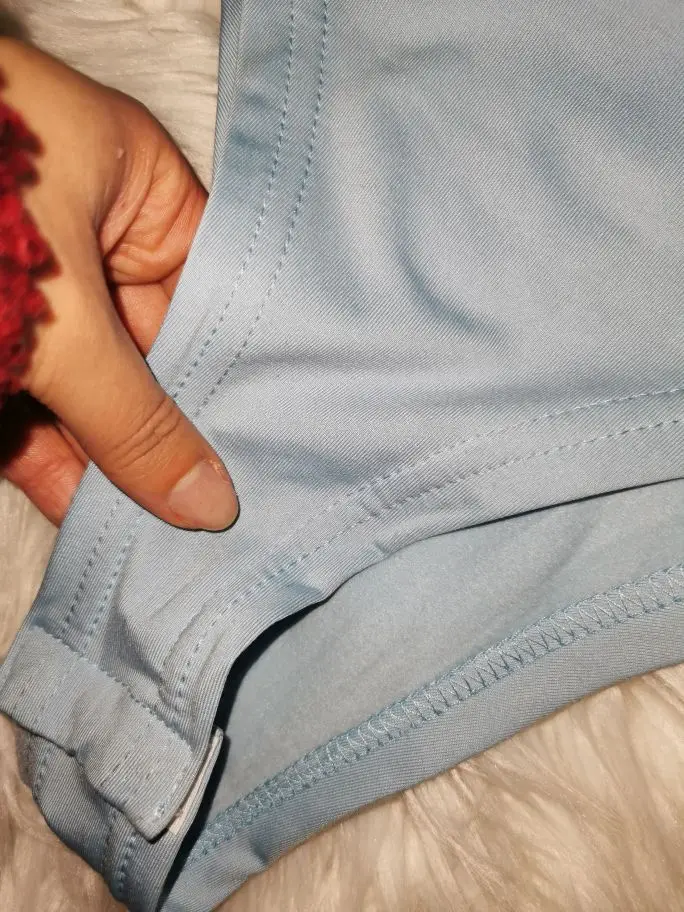 Размер взяла М и долго сомневалась, верно ли подобрала на свои параметры 90-71-94 рост 165, потому что таблица какая-то не очень понятная, но мне все подошло. Материал эластичный, сел как надо по длине и объемам. Материал включает полиэстер и спандекс, снаружи гладкий, внутри небольшой начес. Расцветку выбрала светло-голубую. Пошив хороший, ниточки не торчат, снизу боди застегивается на 3 кнопки.