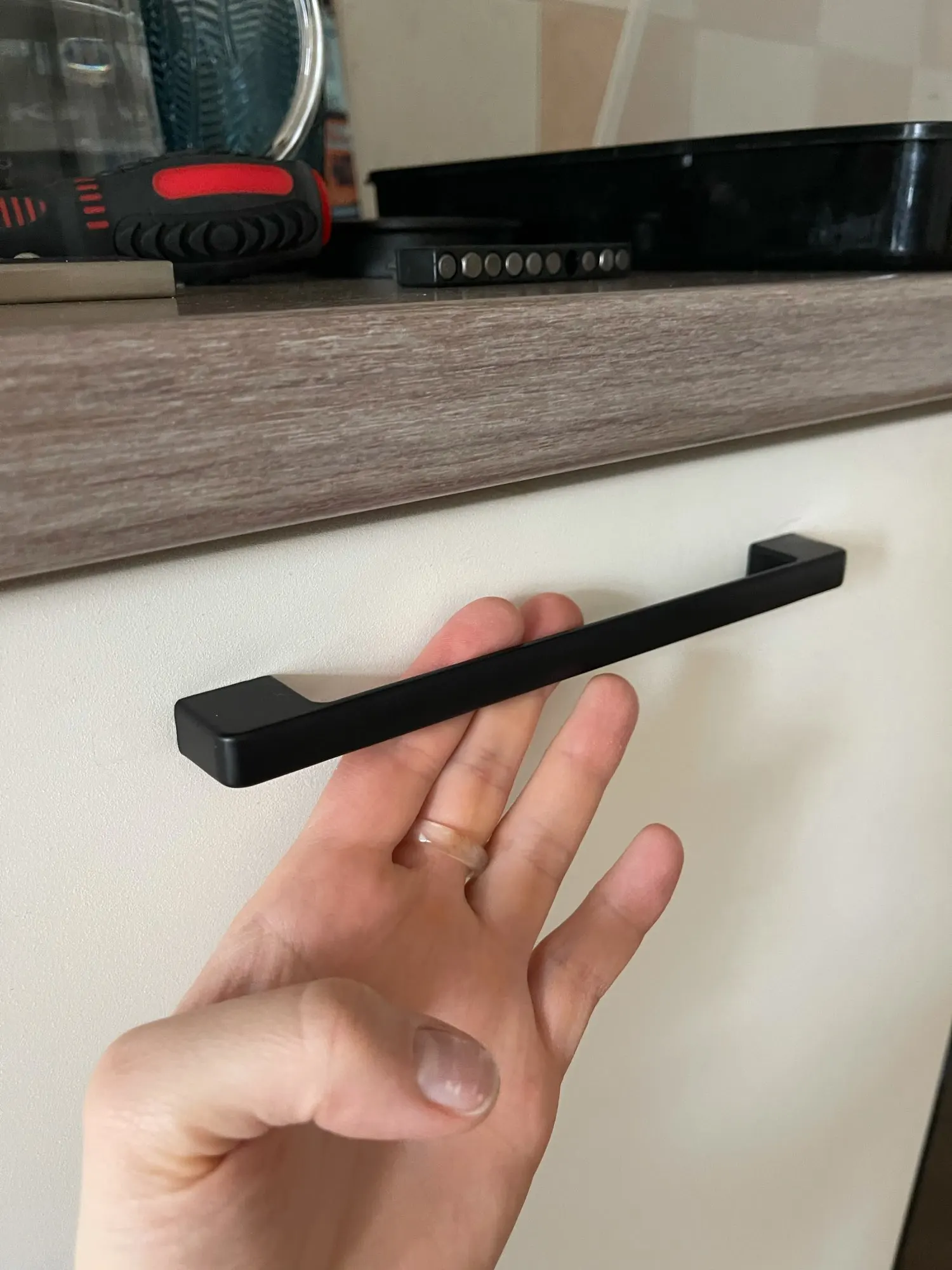 Моя кухня выглядит очень красиво. Красивые ручки. Иногда шнековые отверстия немного слишком короткие. Счастливое применение, чем старые винты. Очень доволен.