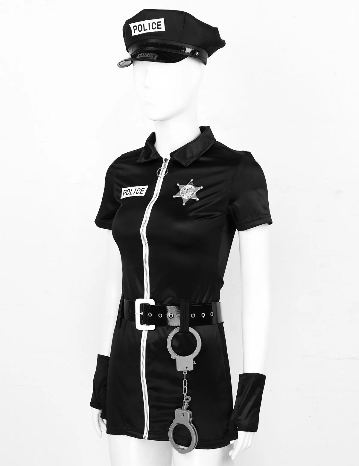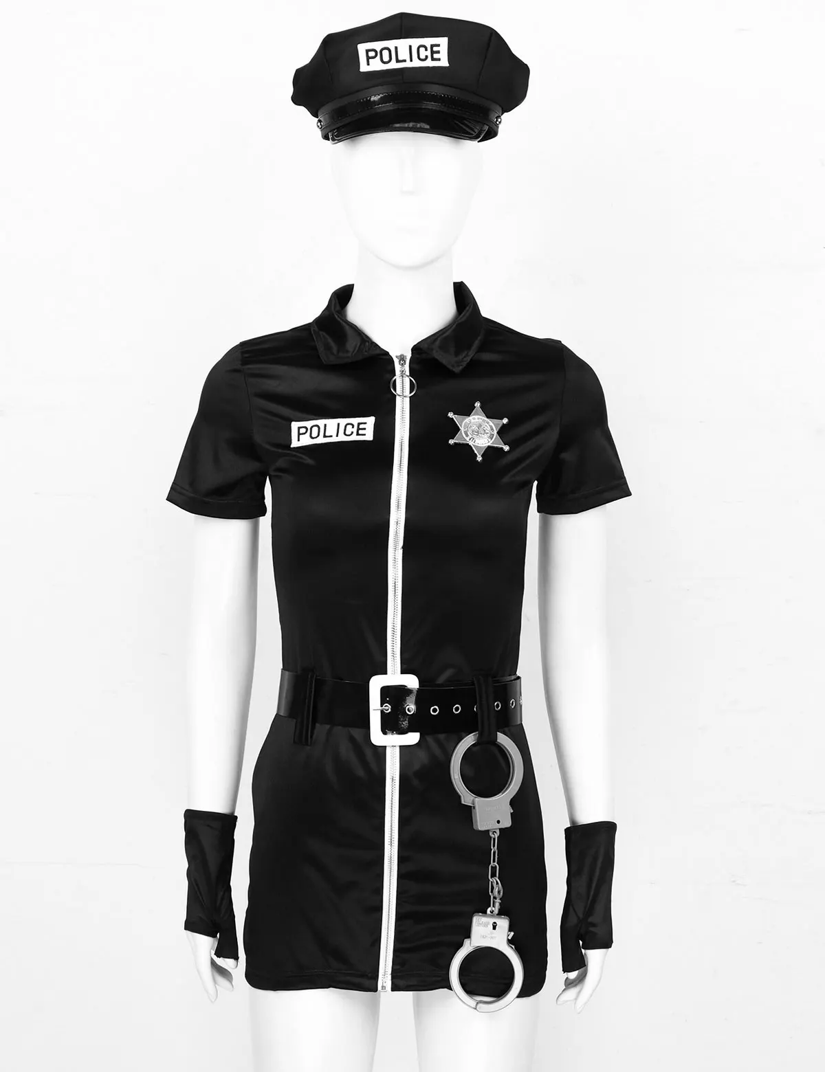 Женский костюм офицера полиции для косплея, костюм полицейского на Хэллоуин, облегающее мини-платье со шляпой, значком, ремнем, перчатками и манжетами