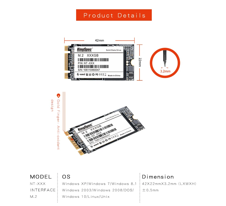 2. Размеры (Д x Ш x В): 2280: l80.0мм * w22.0мм * h3.5мм ± 0,5 мм; 2242: l42.0мм * w22.0мм * h3.5мм ± 0,5 мм.
