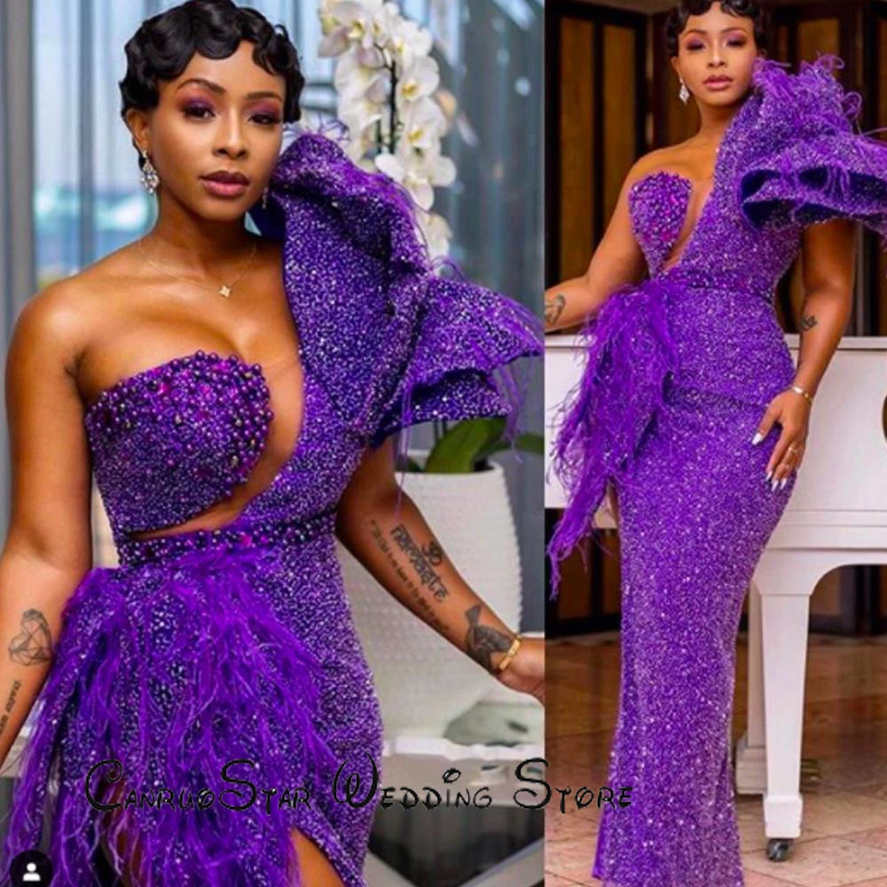 2020 сексуальные фиолетовые платья на одно плечо для выпускного вечера из блестящей ткани с перьями и оборками из бисера Русалка Вечерние платья-Макси для официального вечера