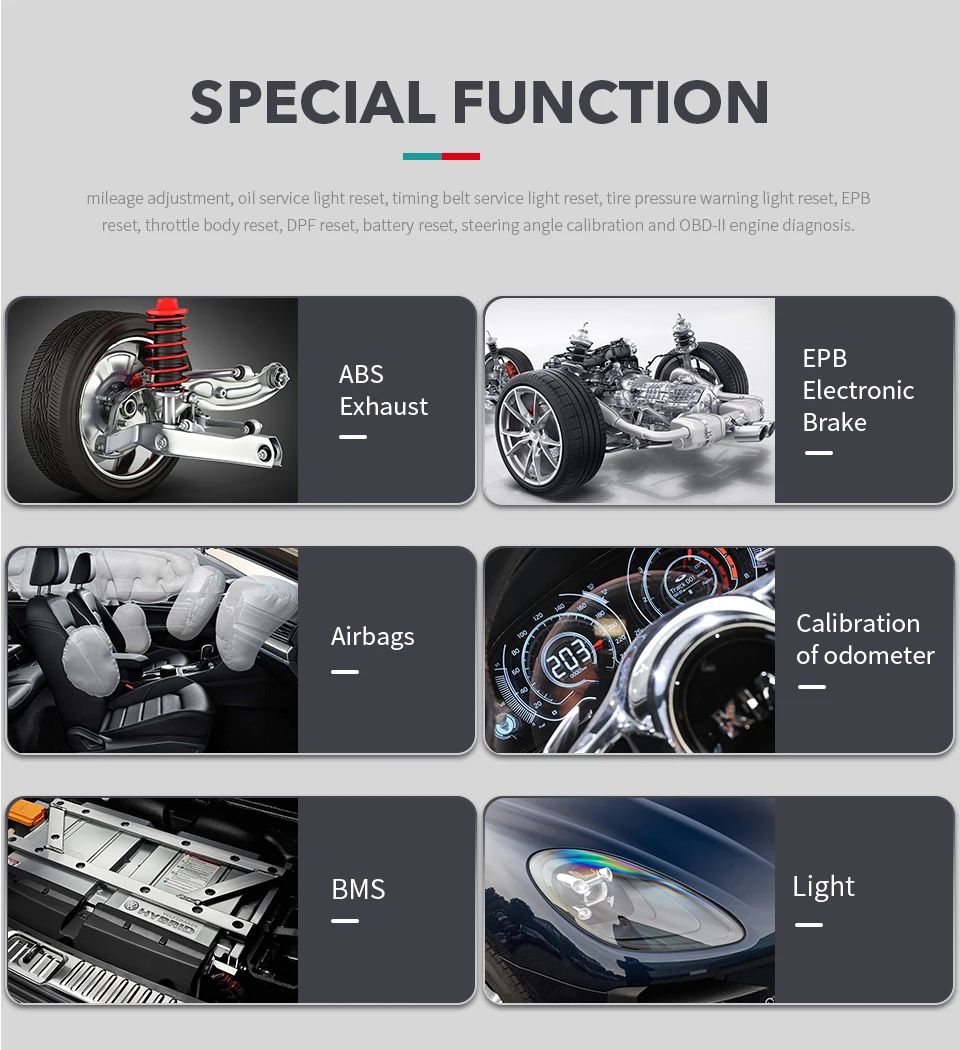 Он не только предоставляет клиентам профессиональное программирование ключей, но и наиболее необходимые специальные функции для мастерской. X-100 PAD-это планшет с новейшими технологиями для программирования ключей, регулировки пробега, сброса освесветильник при обслуживании масла, сброса освесветильник ремня ГРМ, сброса сигнальных ламп давления в шинах, сброса EPB, сброс корпуса дроссельной заслонки, Сброс DPF, сброс батареи, Калибровка угла поворота руля и диагностика двигателя OBD-II.
