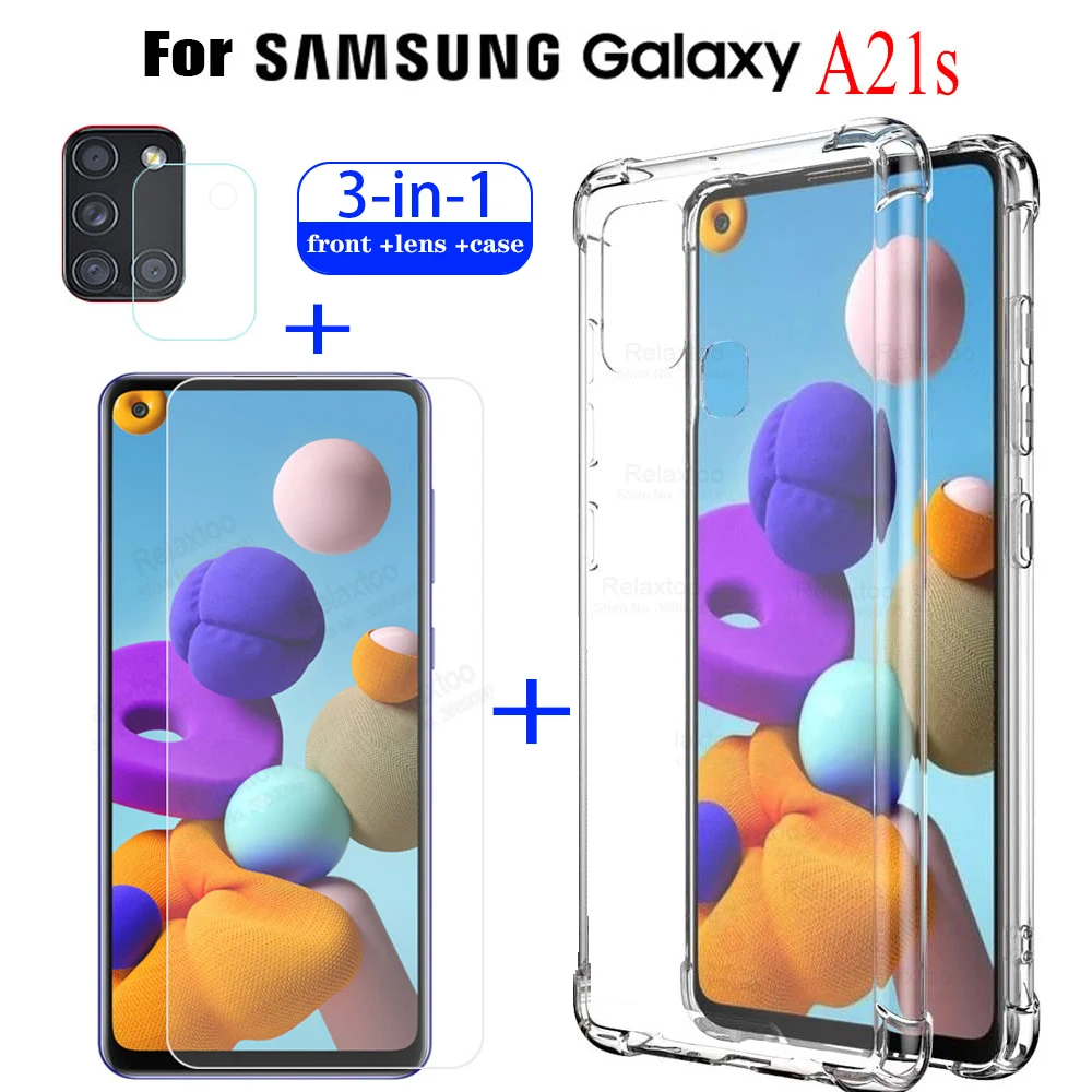 3 в 1 прозрачный силиконовый чехол из ТПУ для Samsung A21s закаленное стекло для Galaxy A21s A21 s Защитная пленка для камеры