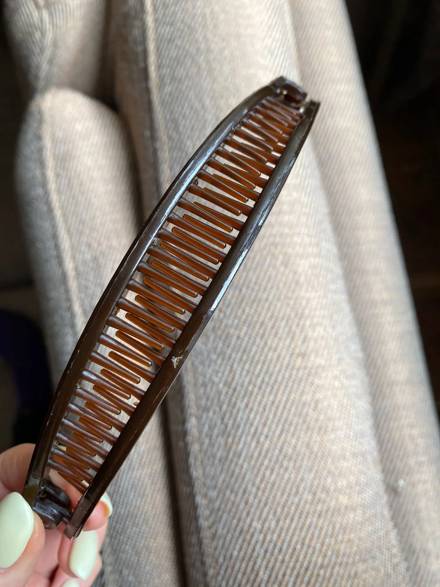 Это следует открыть в одну сторону, чтобы положить волосы в... Интересно узнать, как я надену зажим на кудрявые волосы... Бесполезно...