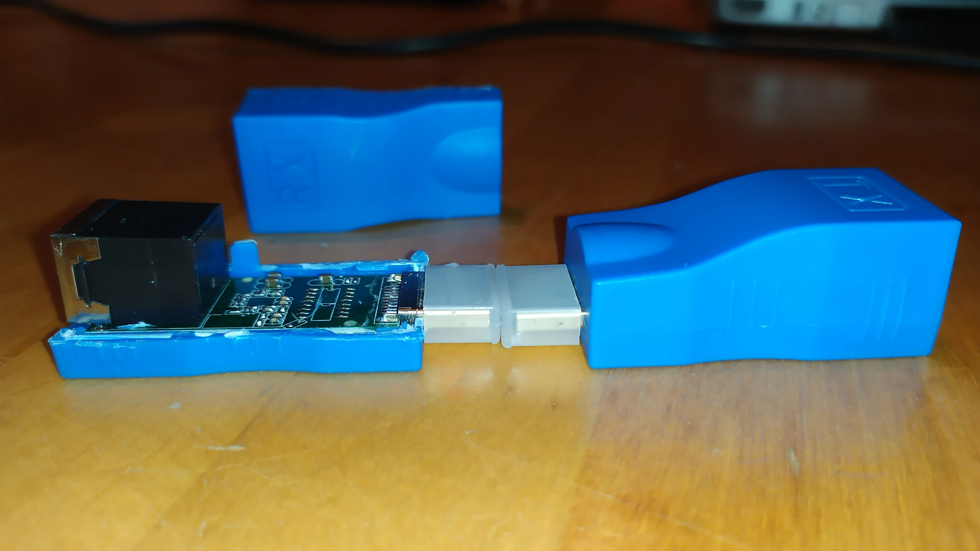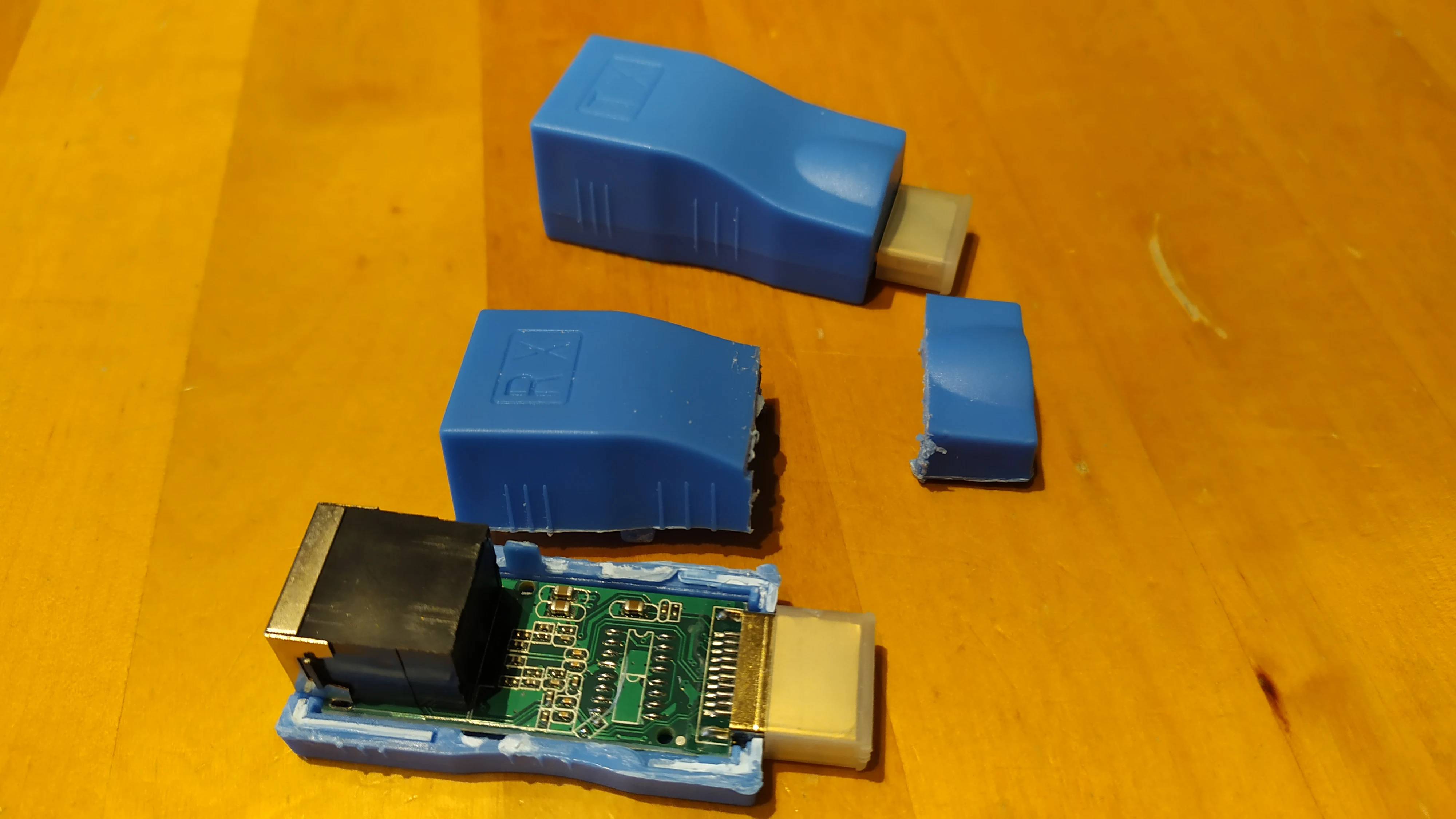 Хорошо работает при тестировании с 1 м свинцом, но... он не поместится в почти любой экран с HDMI, который у меня есть. Ни компьютерный монитор, ни телевизор. Можно только проверить его на одном из 4 экранов, и он также не вполне подходил там... Продавец был достаточно хорош, чтобы позволить мне попробовать отрезать немного пластика, так что вот дополнительные фотографии. Тупая часть заключается в том, что нет необходимости в большом корпусе, так что я мог бы легко отрезать большой кусок пластика или в реальности даже оставить пластик полностью (и распылить печатную плату с пластиковой печатной платой-спрей у меня в любом случае, а затем положить немного ленты это). Это не чудо-решение, на которое я надевал, но я слишком много жду от нескольких евро, которые я заплатил. Это будет достойное решение для подключения телевизора, который доступен только с нижним ethernet-кабелем, который я могу обжимать разъемы на себе (в отличие от HDMI коннекторов, которые я не могу обжимать или правильно припой.)