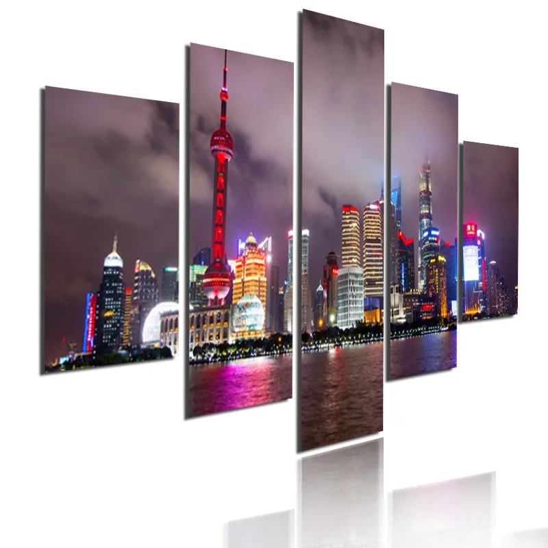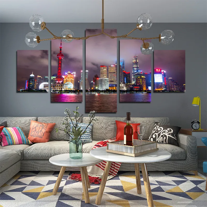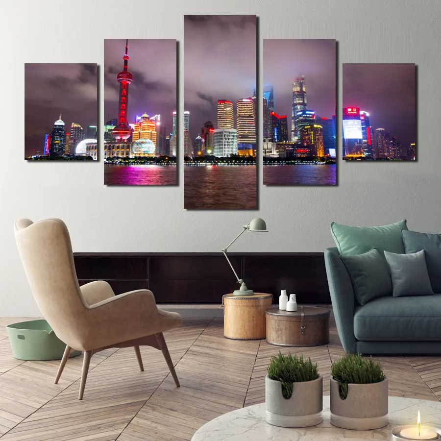 Освещенные пейзажи ваньцзя в прибрежном городе Гонконга ночью. Цветной плакат. Холст с принтом для домашнего интерьера