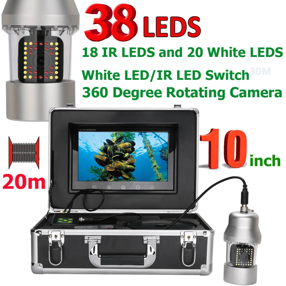 Подводная рыболовная видеокамера с 38 светодиодами и поворотом на 360 градусов, 10 дюймов, 20 м, рыбопоисковый прибор с водонепроницаемостью IP68