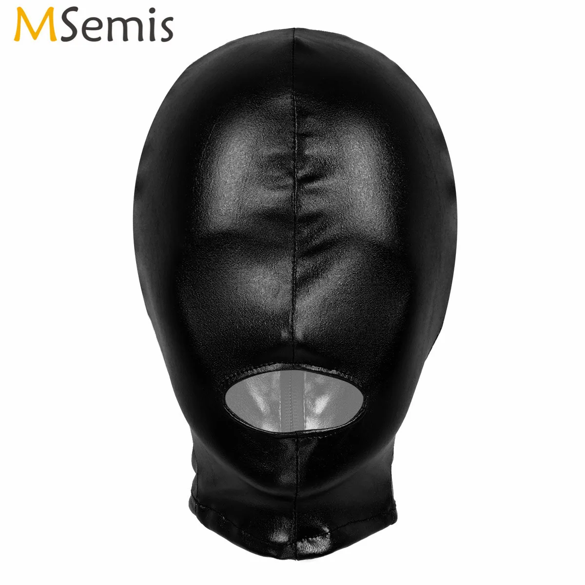 Унисекс, для взрослых, косплей, полная маска для лица, для женщин и мужчин, сексуальный, для ролевых игр, латексный головной убор, блестящий, металлический, открытый рот, отверстие, капюшон, костюм, клубная одежда