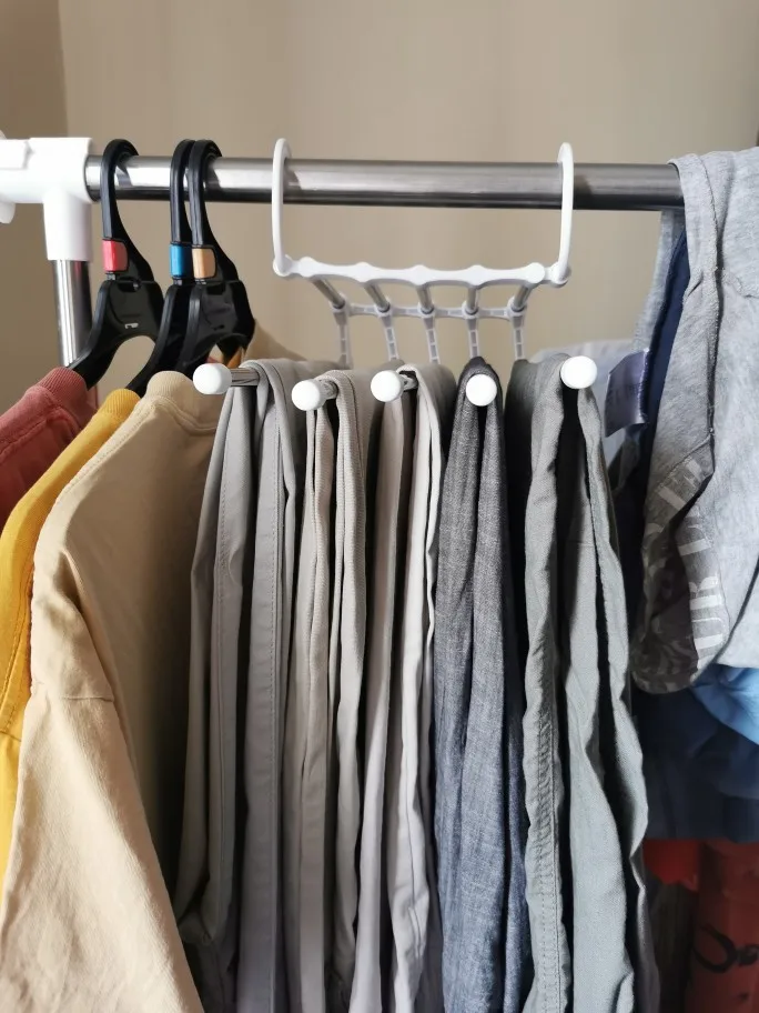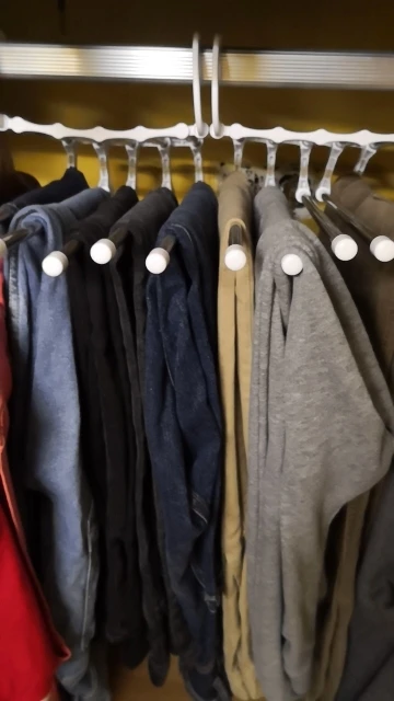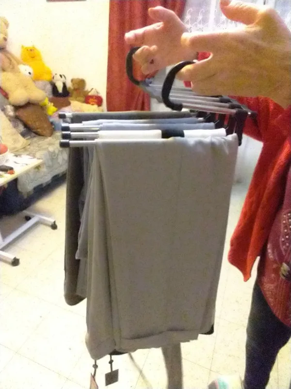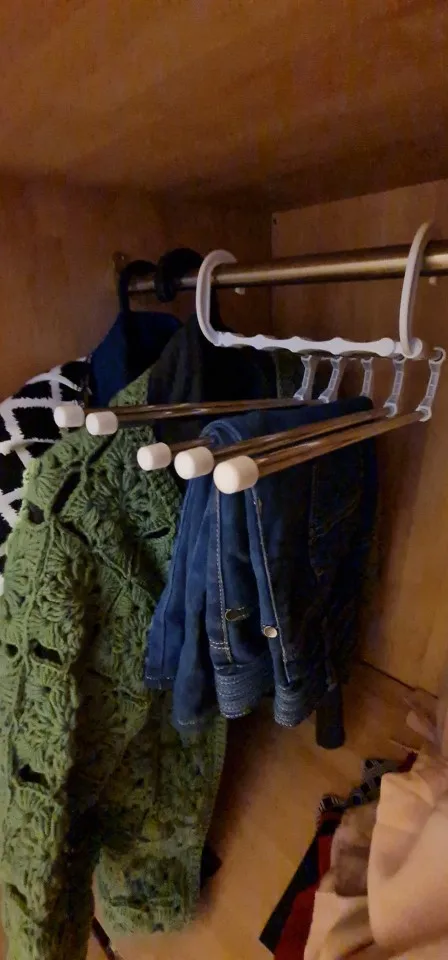 Вешалка не выдержит долго тяжелые джинсы она из нержавеющей стали, конечно, но все перемычки из пластика, а так удобная штука, много места не занимает