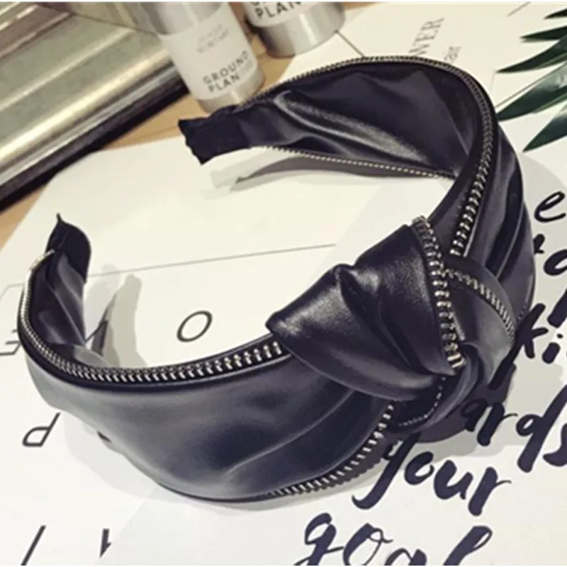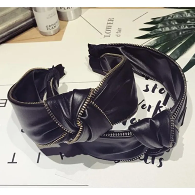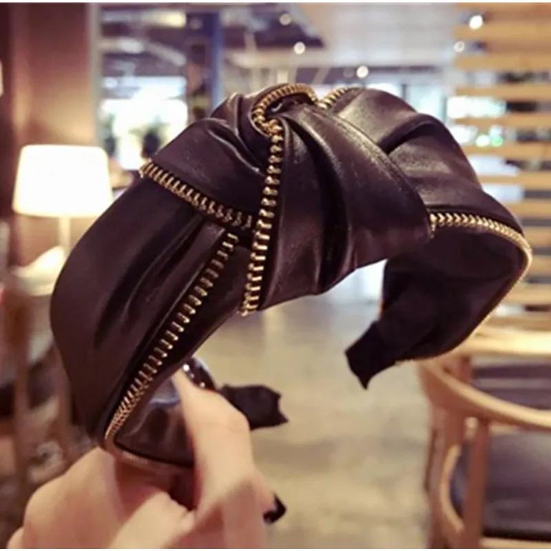 Из искусственной кожи черного цвета, лента для волос с застежкой-молнией, декорированные цепочкой для женщин аксессуары для волос Одежда высшего качества повязка на голову широкая повязка на голову взрослый ободок