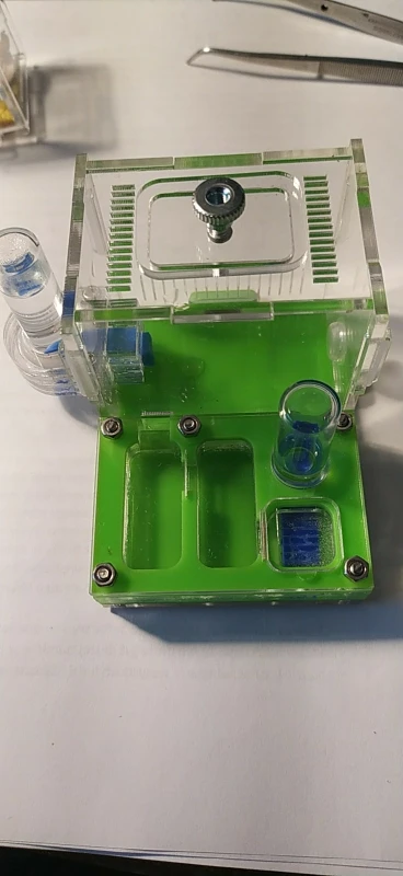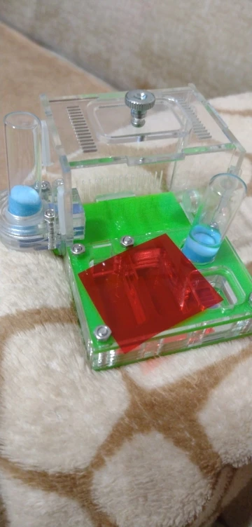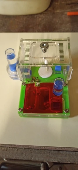Ha llegado perfecto, muy bien embalado. De muy buena calidad, para montarlo hay que poner las arandelas que sujetan los tubos una posición mas alta, hecho esto, se tiene un muy buen sistema de humedad y bebedero que suministrará agua a las hormigas. Por su tamaño es ideal para poner una reina sola, se puede cerrar con su compuerta de acetato que también viene, la cámara húmeda para los primeros tiempos de la reina. También se puede cerrar otra cámara más con compuerta de acetato. Trae piezas de más, así como un tubo de vidrio de más. Los tubos de vidrio se pueden sustituir por tubos de ensayo de plástico, más largos y con tres veces más capacidad de agua. De inmediato hemos hecho alguna modificación para dar obscuridad, en los cantos con cinta negra y en la parte superior con acetato (estas dos cosas no vienen). BUEN HORMIGUERO para empezar una colonia.!
