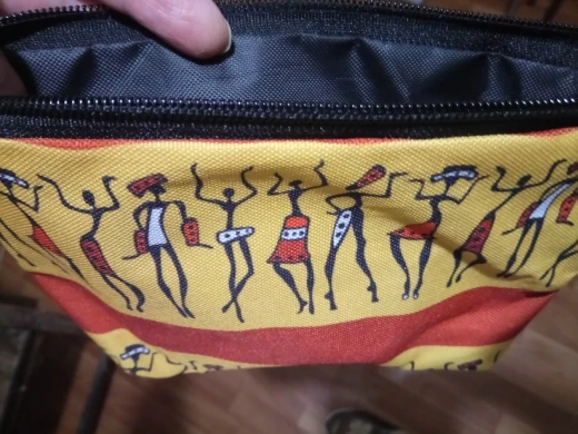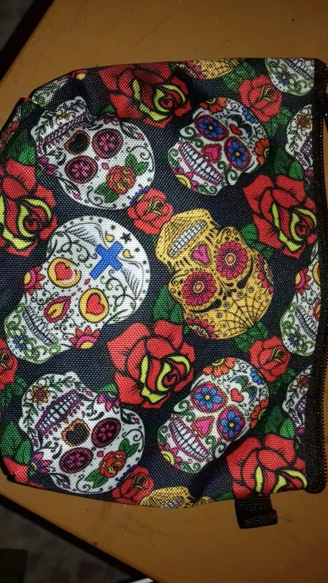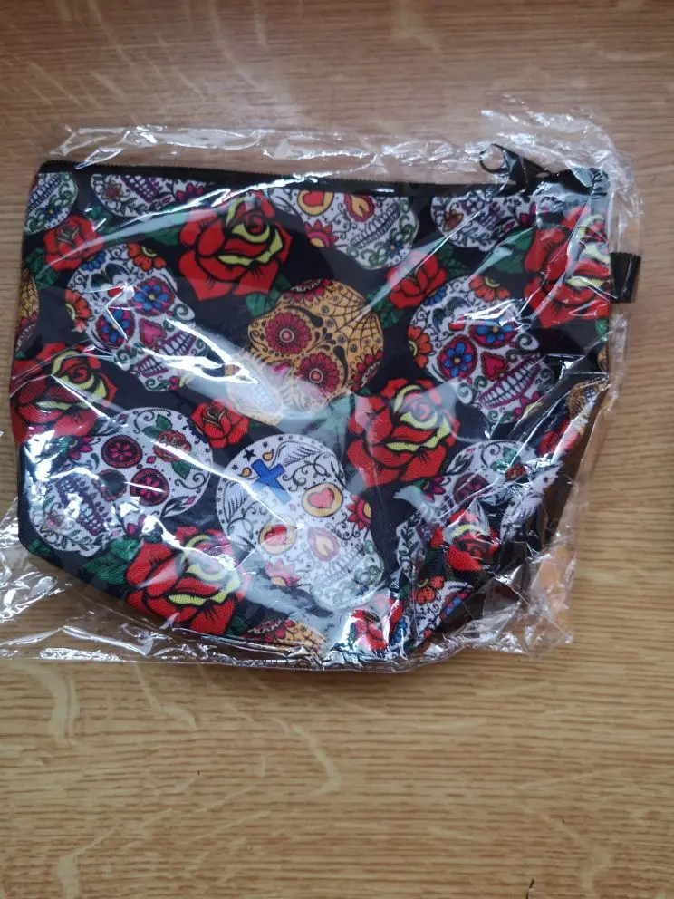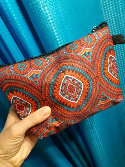косметичка из плотной ткани, размеры норм. рисунок только с одной стороны, с другой черный материал типа оксфорда. доставка быстрая.