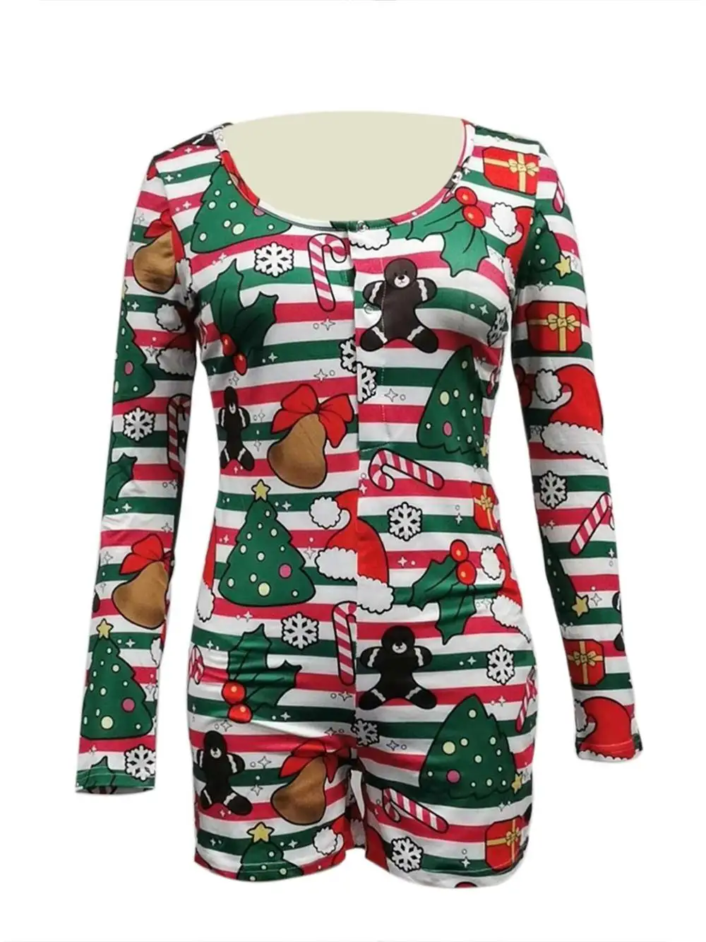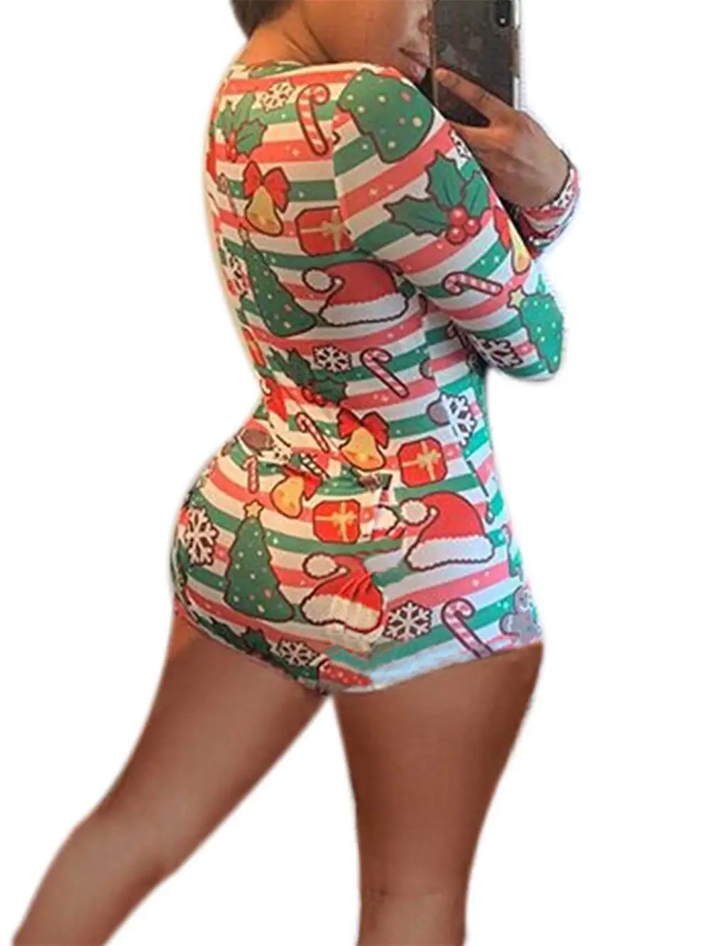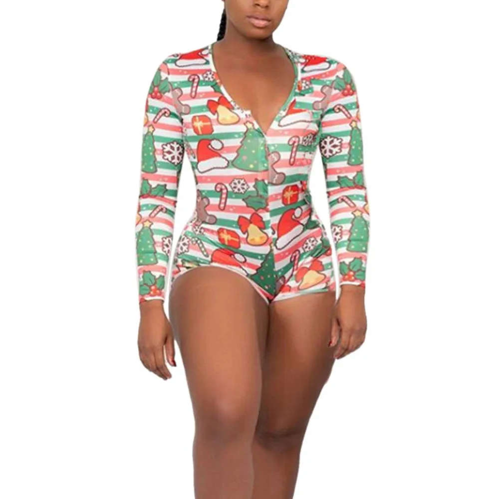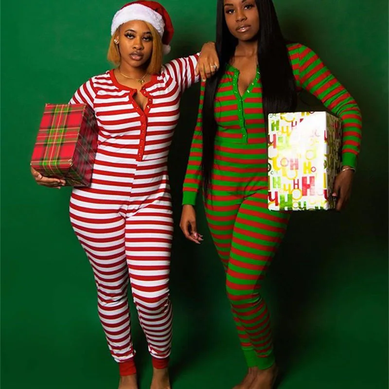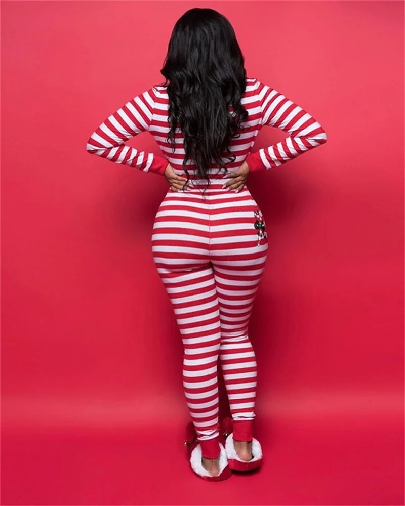 Женская рождественская пижама в полоску, сексуальный эластичный комбинезон с круглым вырезом и длинными рукавами, повседневная жизнь и праздник