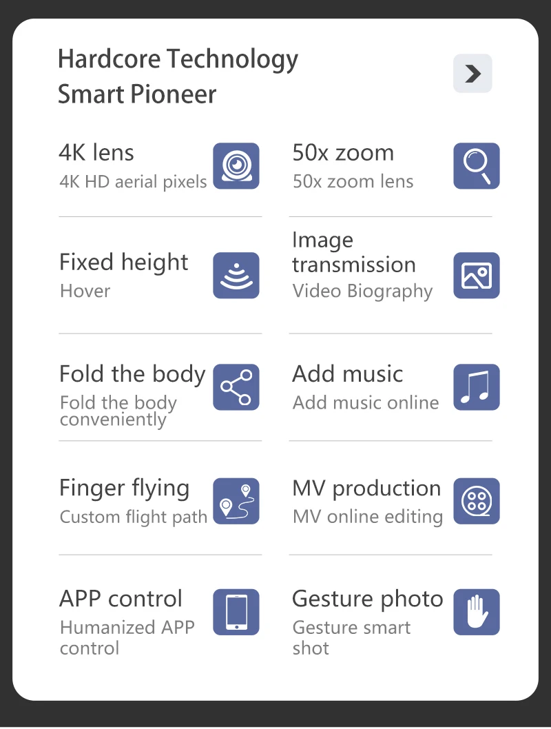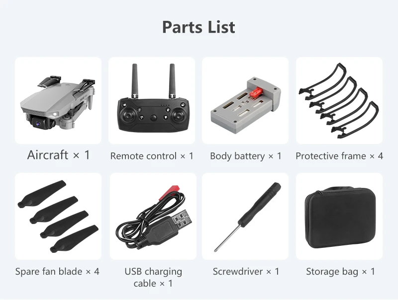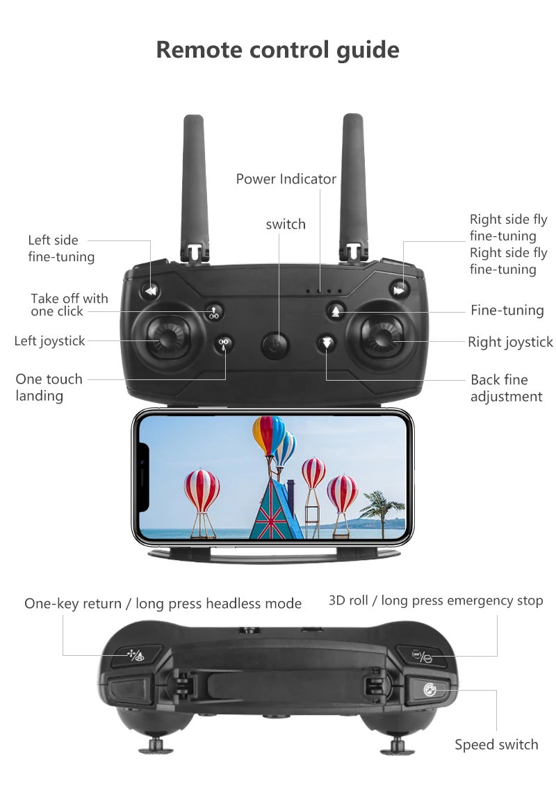 Функции: вверх/вниз, вперед/назад, поворот влево/вправо, боковой полет, трехуровневая скорость полета, светодиодный свет, Безголовый режим, автоматическое возвращение одной кнопкой, режим удержания высоты, передача WIFi