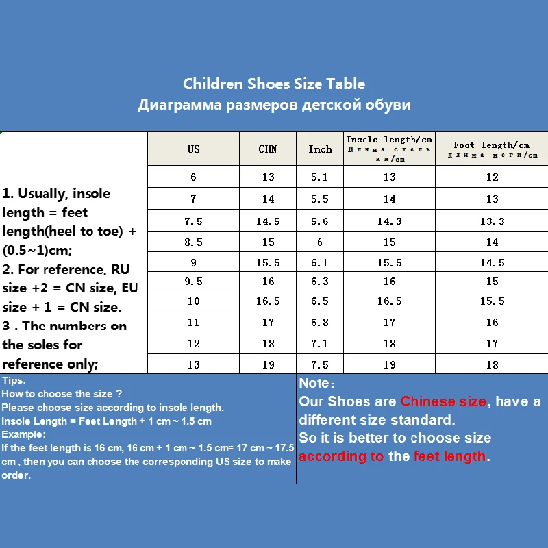 1. Американский размер-это не стандартный размер обуви.2. Пожалуйста, измерьте длину стопы вашего ребенка, обратитесь к таблице размеров, а затем выберите обувь дляВаш ребенок.