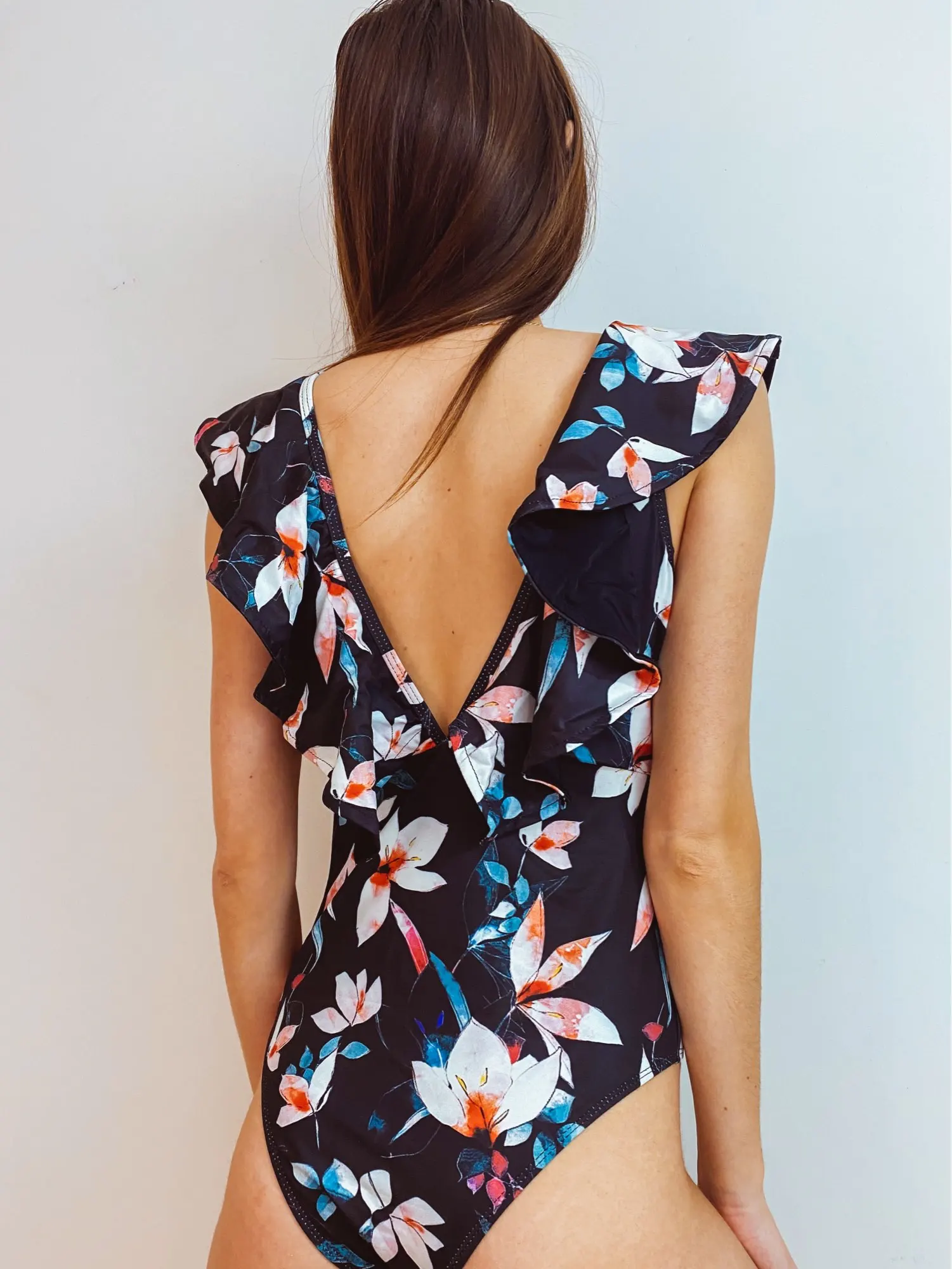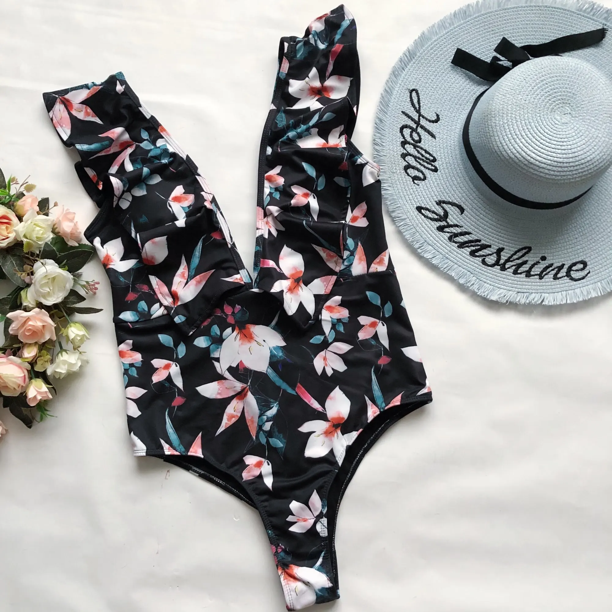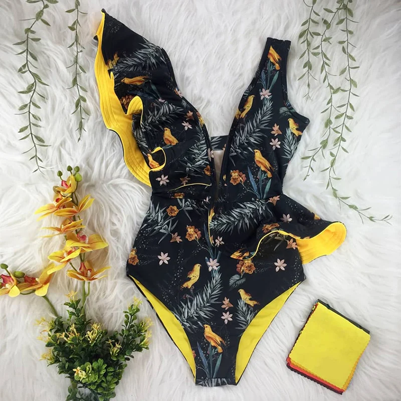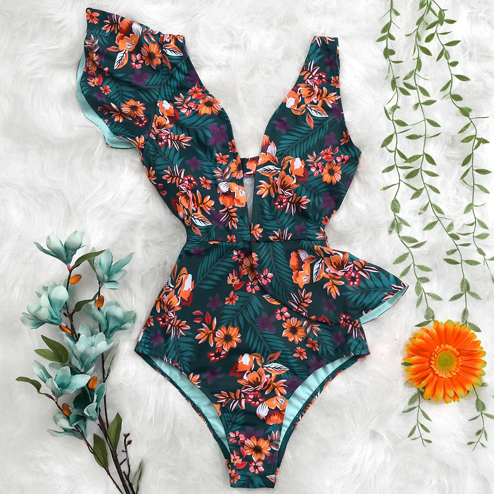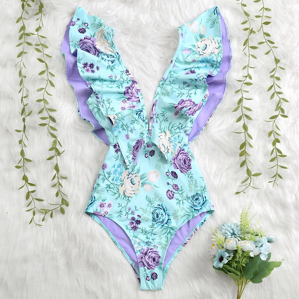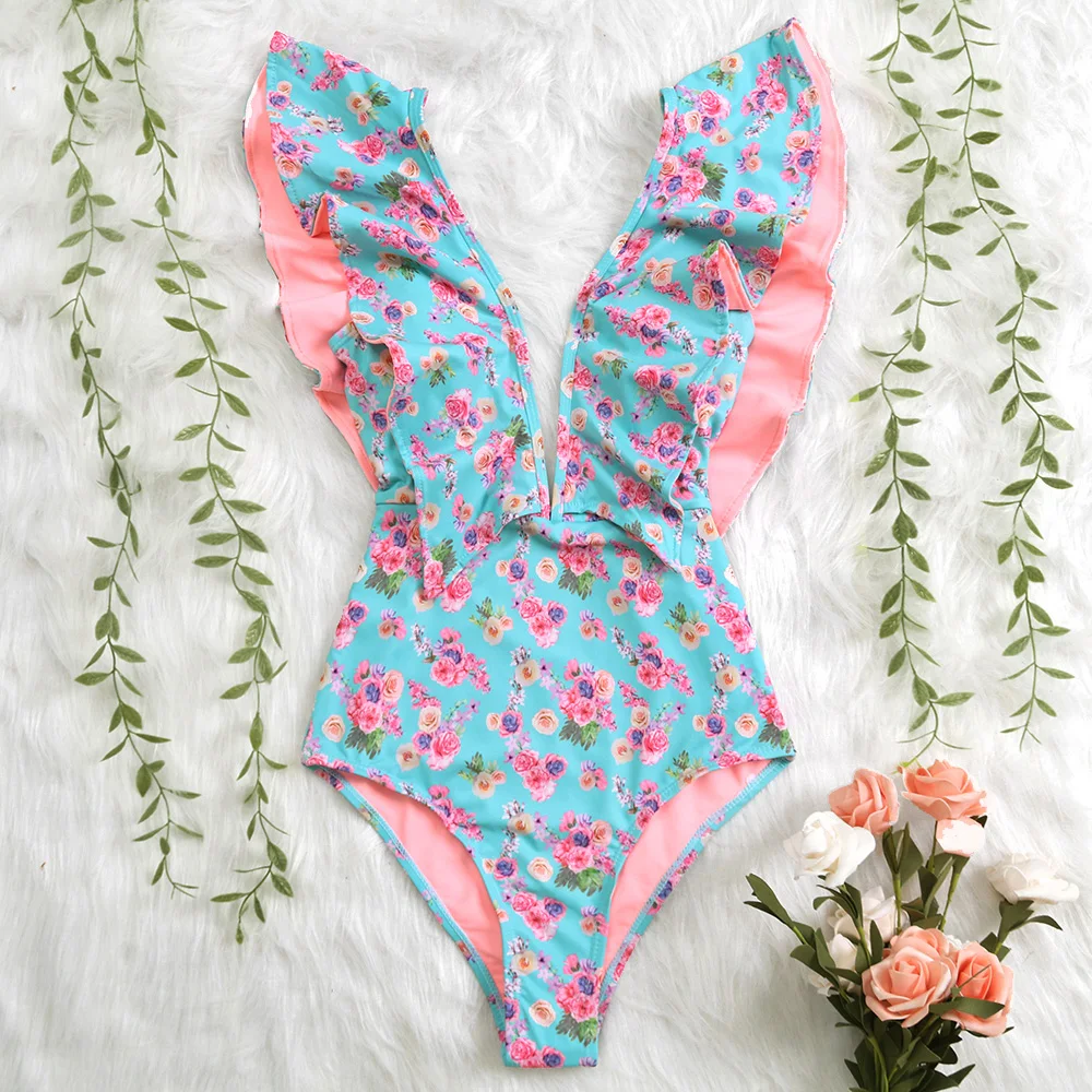Слитный купальник с глубоким V-образным вырезом и рюшами, пуш-ап, с принтом, для пляжа, монокини с открытой спиной, 2021