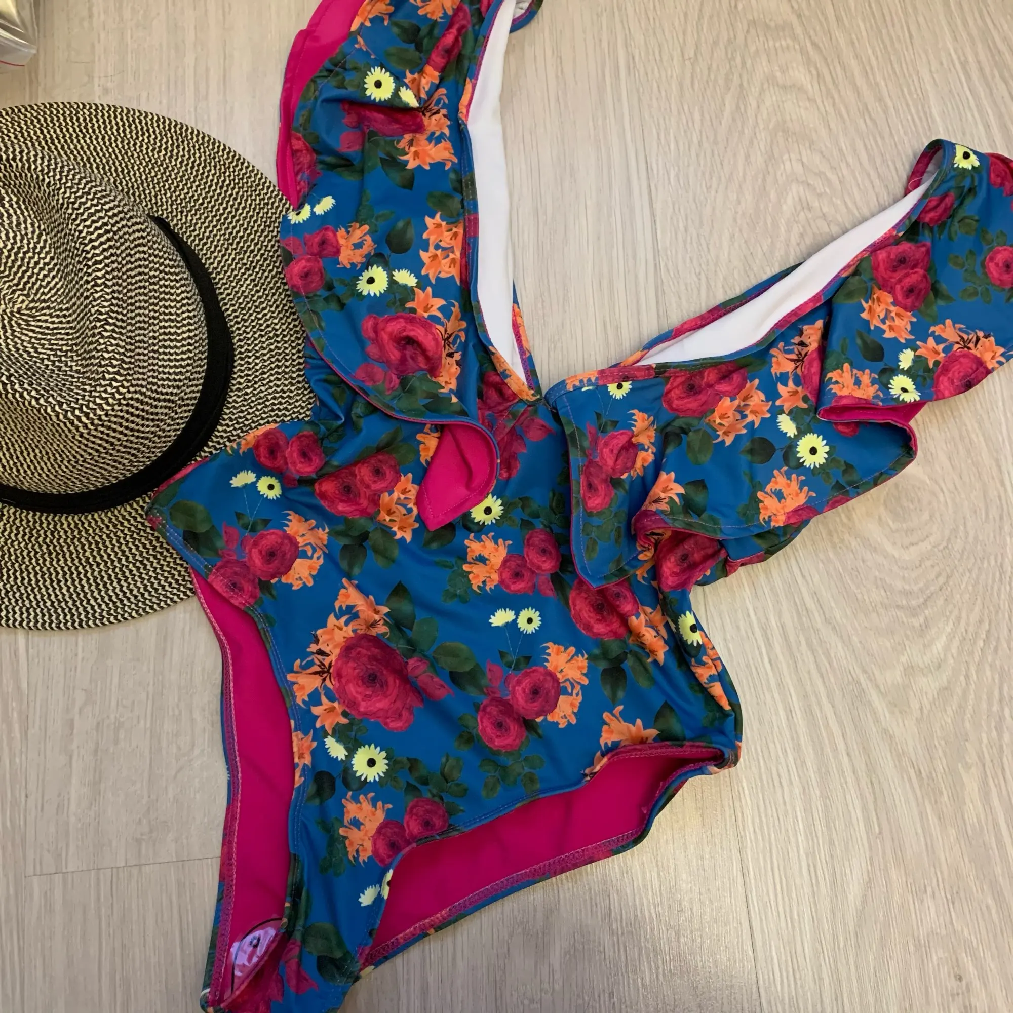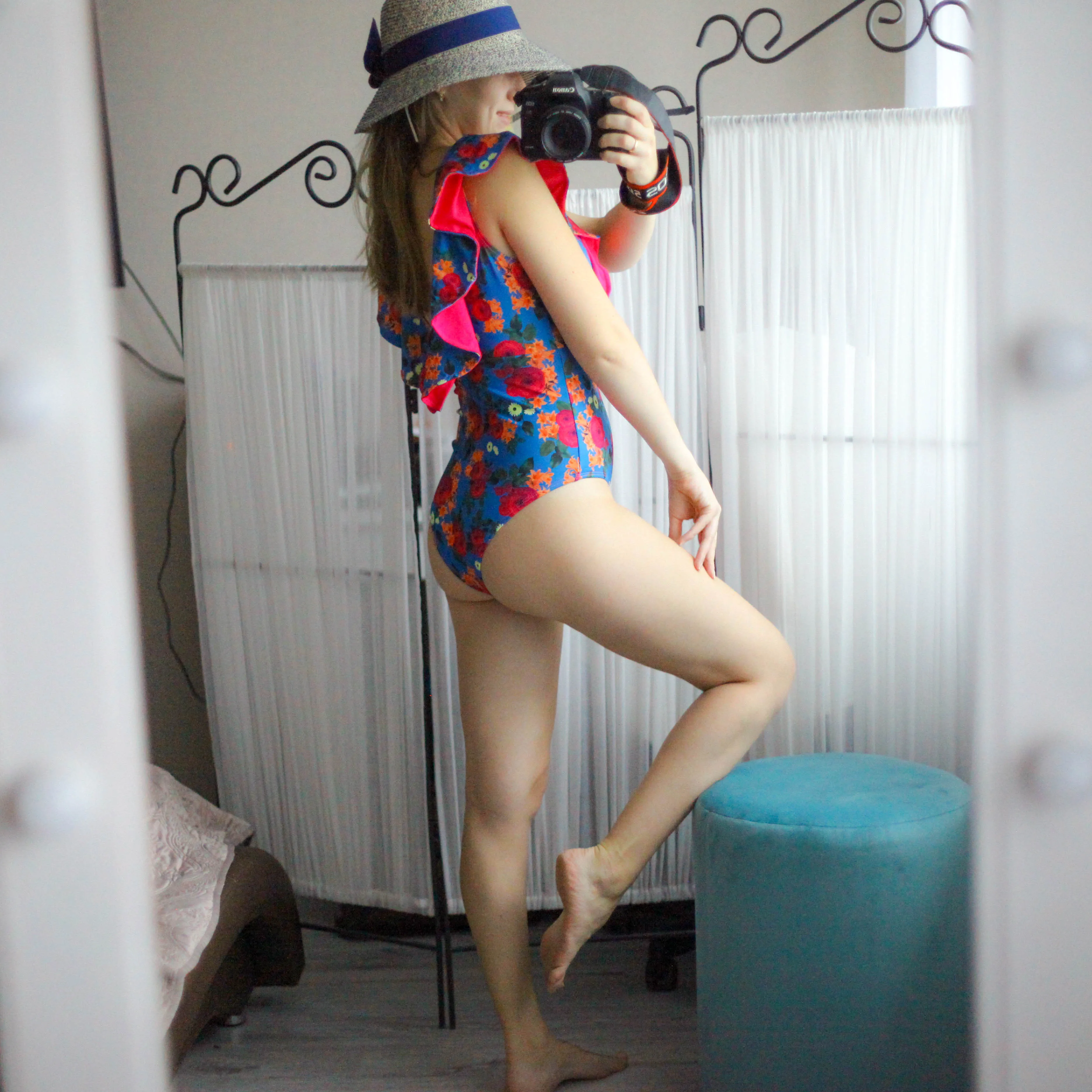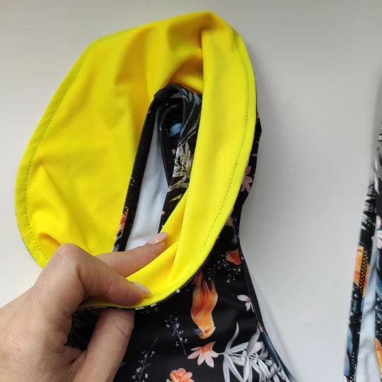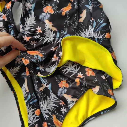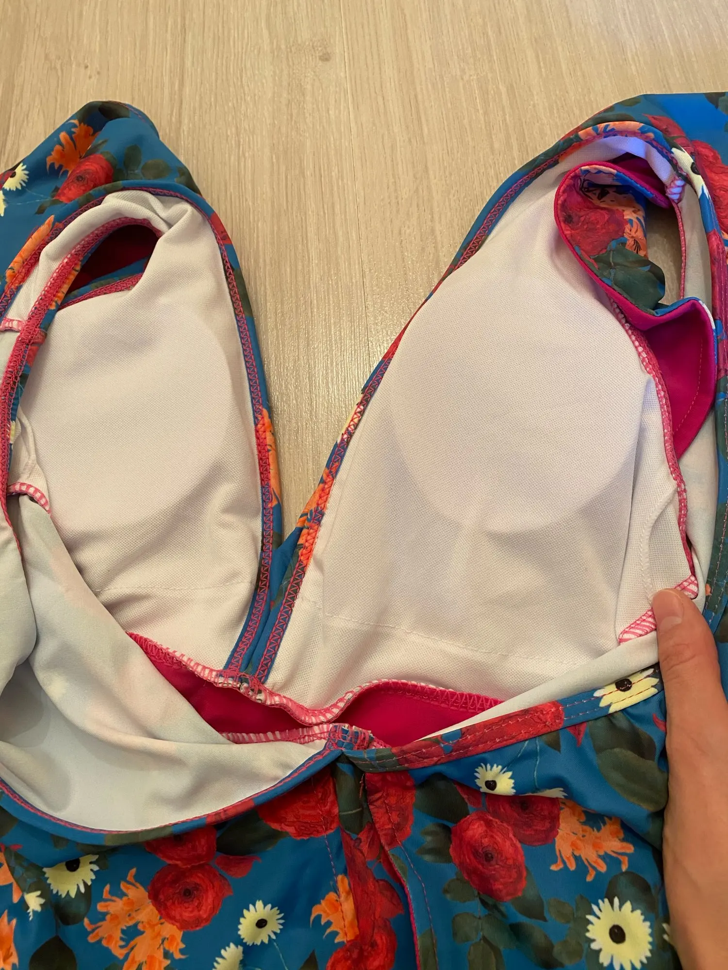 На свои параметры 84-63-83, рост 167 см я заказала размер S, сел купальник по размеру. Лямки никак не регулируется, они украшены воланами, на лифе имеется небольшой пуш-ап, (при желании можно его убрать). Эта модель купальника очень красиво моделируют фигуру скрывая все её недостатки. Идеальный купальник для меня, потому что он такой яркий, летний, делает фигуру эффектной, убирая все лишнее. Внутренняя сторона выполнена из яркой ткани цвета фукции На ластовице имеется гигиеническая бумажная наклейка. Принт в виде ярких цветов напечатан очень красиво, при стирке и на солнце цвет не выцветает. Качество пошива отличное, швы все ровные, без пропусков, зазоров и торчащих ниток. Безумно довольна приобретением!