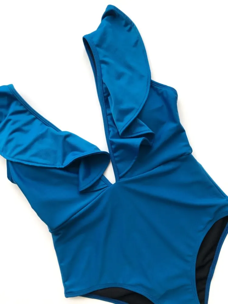 Слитный купальник декорированный рюшами-оборками в виде декольте. Рюши у данной модели довольно объемные. Цвет Красивый насыщенный темно-бирюзовый Вырез в зоне декольте достаточно глубокий , но удобный в движений . Доставка в пункт выдачи , либо курьером до двери .