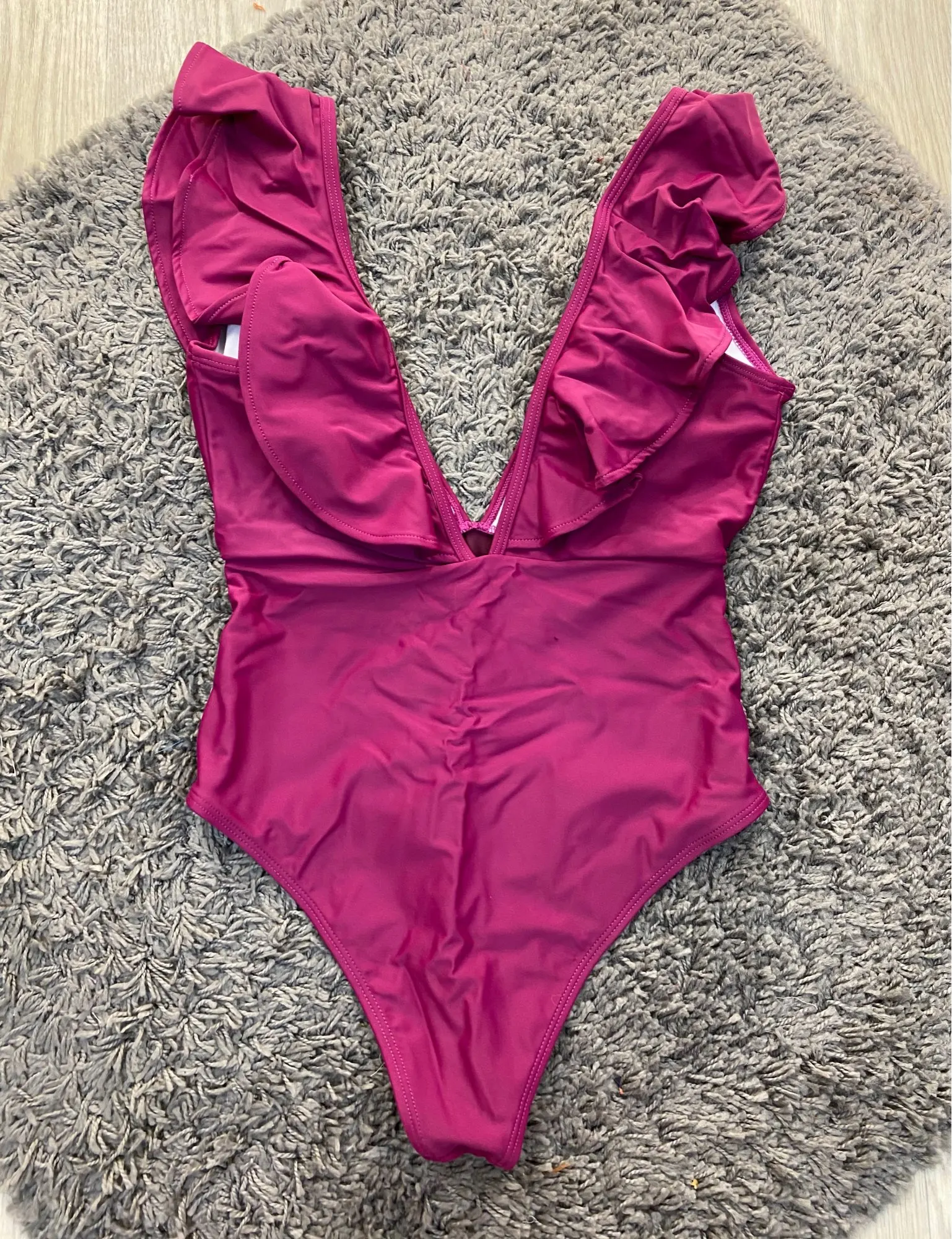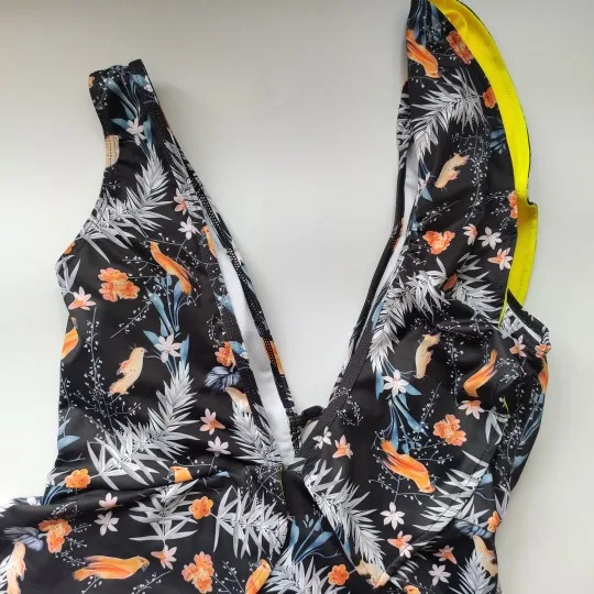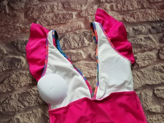 Купальник очень хорошего качества, всё прострочено и обработано. Крупный волан и глубокий вырез. на маленькую грудь буду зашивать вырез.S хорошо на европейский S. Рекомендую к покупке. Спасибо.