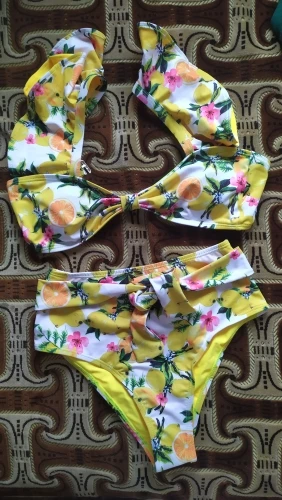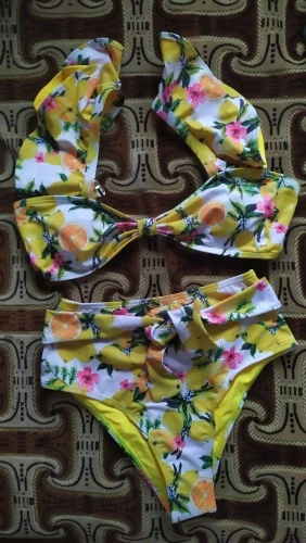 ⠀ Яркий купальник с жёлтым топом с рюшами и завышенными трусиками слипами. Верх на бретелях. Бретели регулируются . Сам по себе купальник белый с принтом «лимон». Пошив отличный. Доставка в пункт выдачи около двух недель.