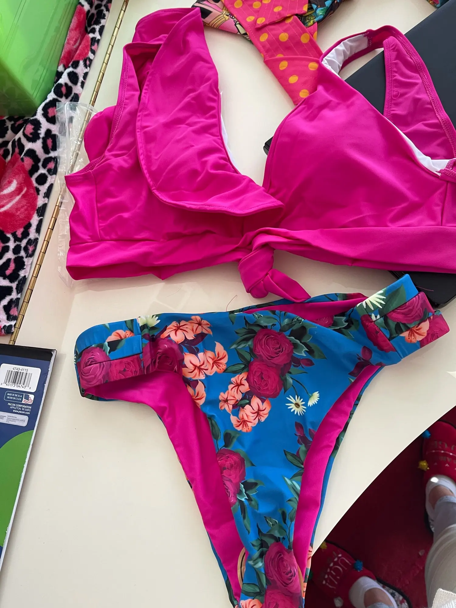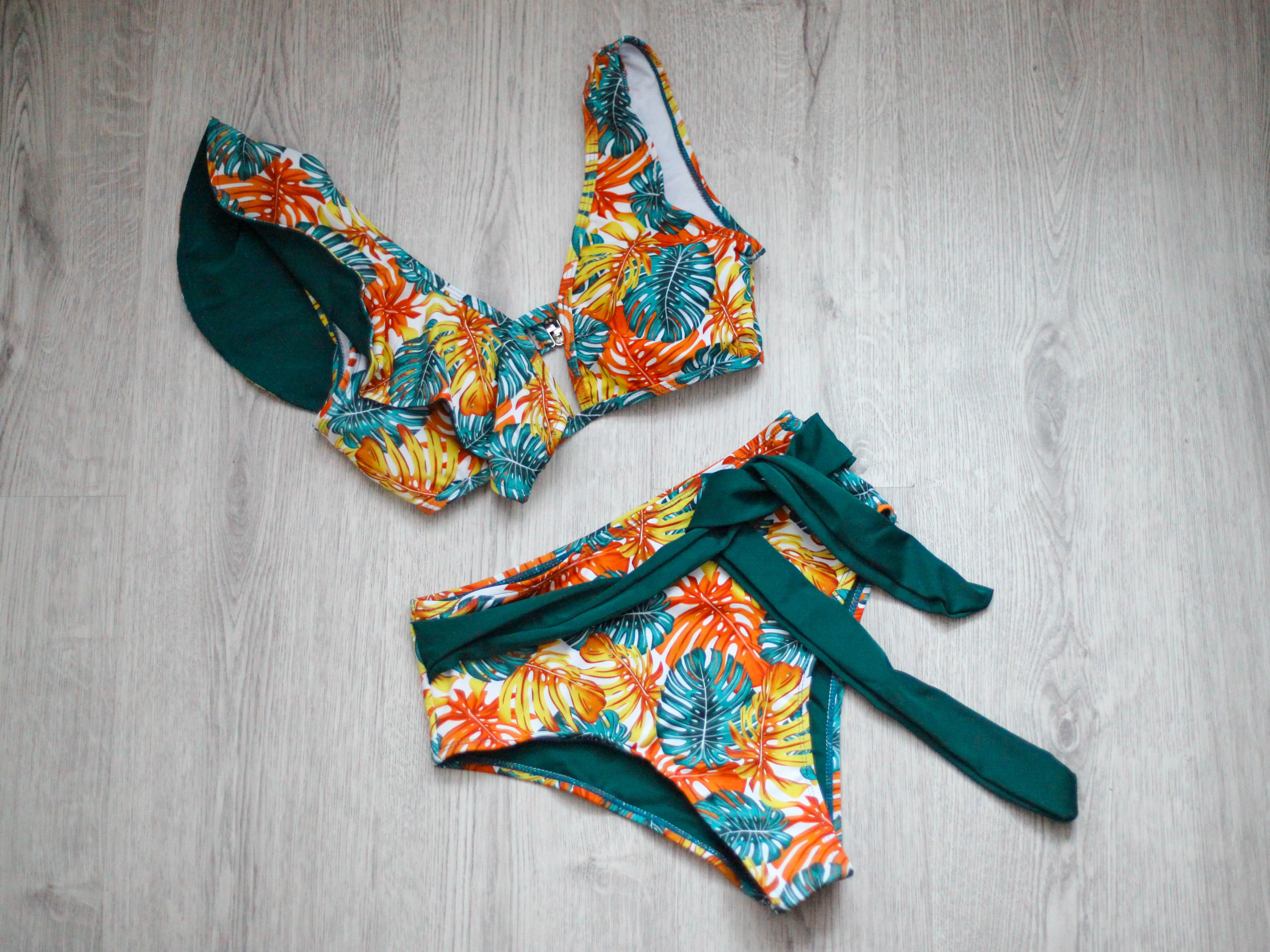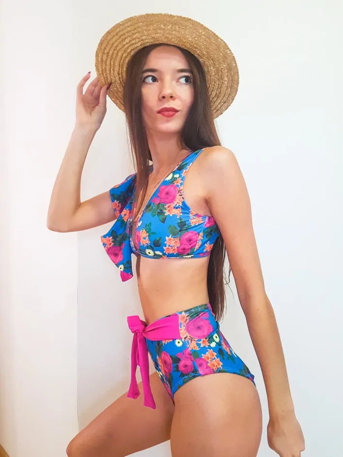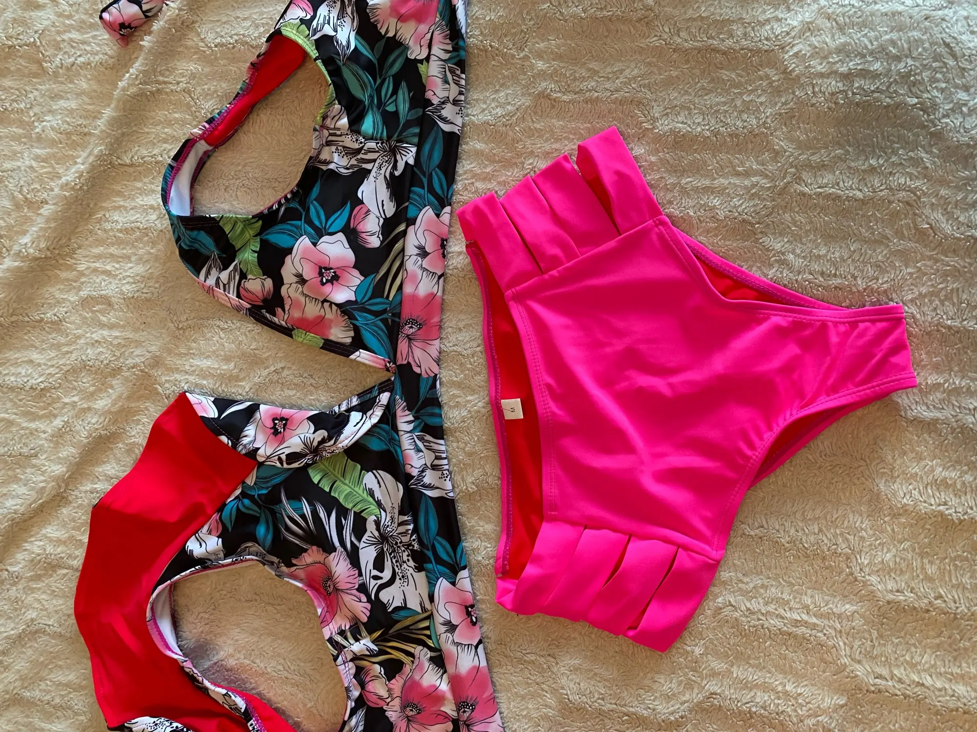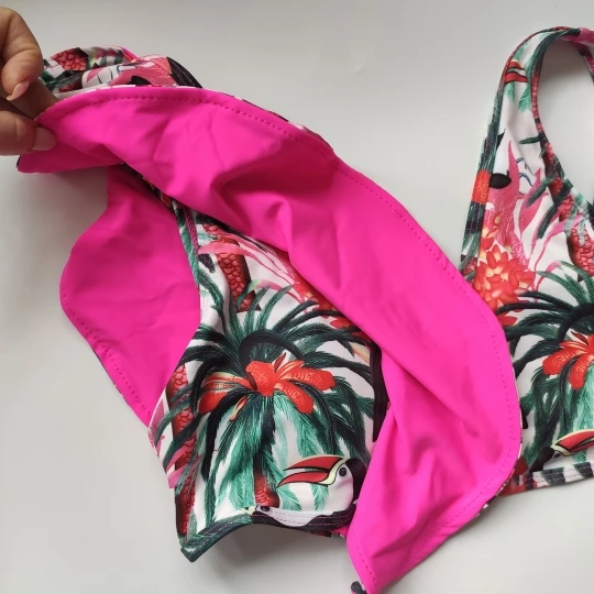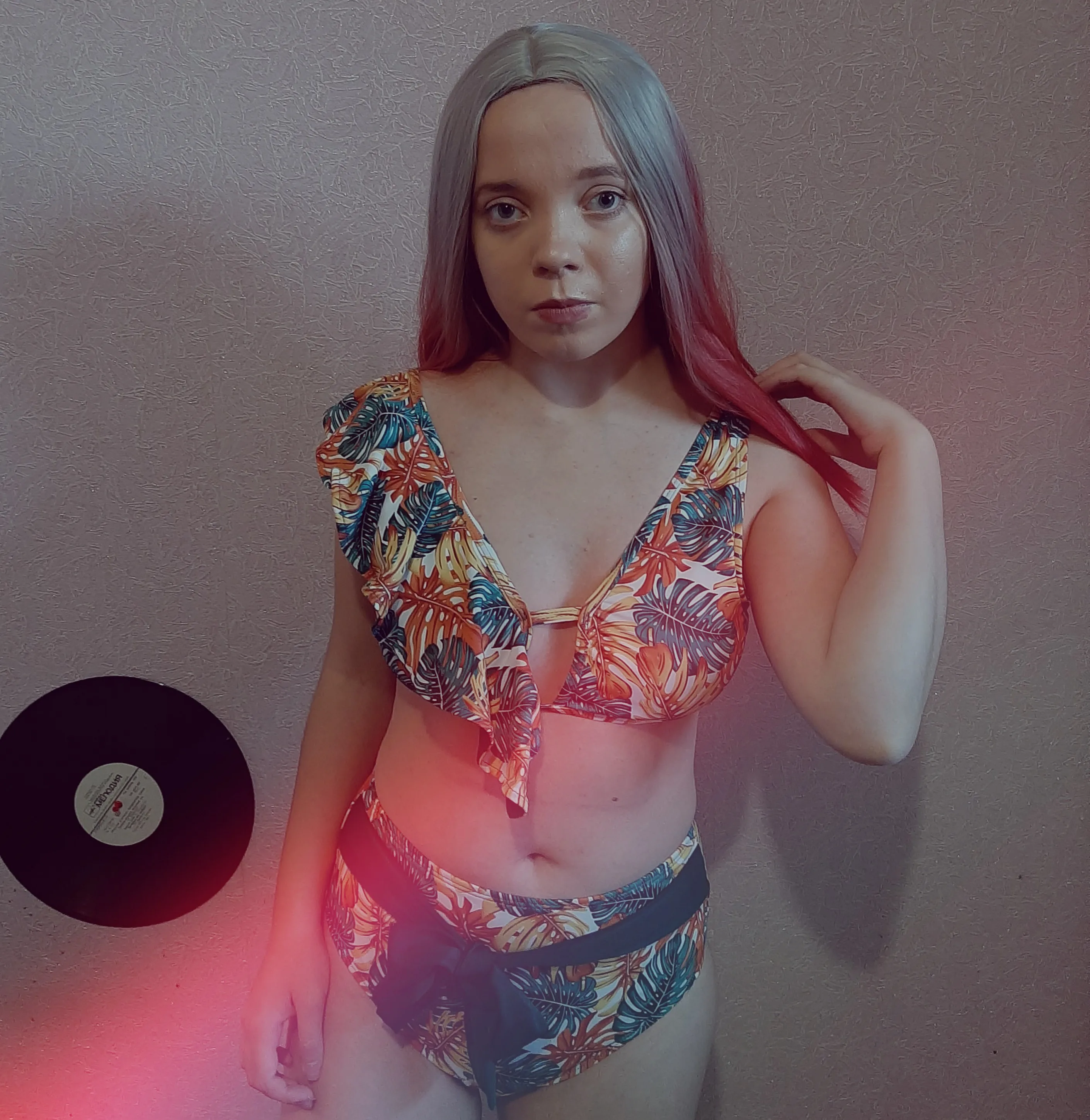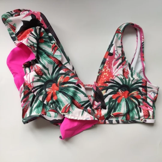 Очень Яркий купальник ! ●На мои параметры 84-60- 85 размер С садится шикарно. ● Состав polyamide 82% + elasthane 18%, ткань приятная, эластичная, хорошо тянется. ●Пошив аккуратный, строчки ровные, нитки не торчят.Качество идеальное. ●Топ: -отлично держит грудь; - рюши на одно плечо; -есть сьёмные чашки; - сзади металический крючок; ●Плавки: - с высокой талии очень удобные; -спереди есть завязка; - подкладка не выворачиваеться наружу; -есть гигиеническая наклейка; -цветочный принт. Выглядит очень привлекательный!