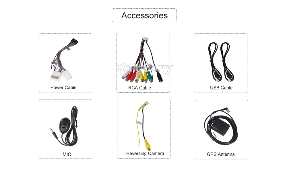 Один кабель RCA с внешним входом микрофона, один кабель камеры заднего вида с Wi-Fi и сигнальными кабелями BT, один антенный кабель GPS, два usb-кабеля, один установочный инструмент и один внешний микрофон в качестве подарка
