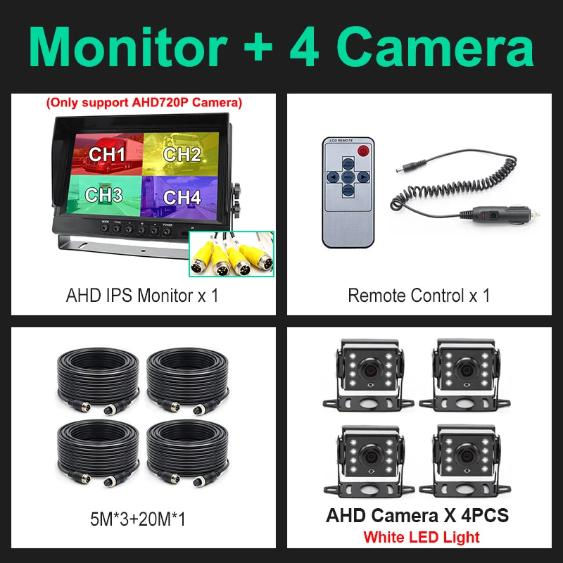 9-дюймовый AHD DVR мониторAHD 720P камеры (1 ~ 4 шт, опционально)Пульт дистанционного управления4 pin видеокабель (Длина и количество не являются обязательными)Кабель питанияРуководство пользователя