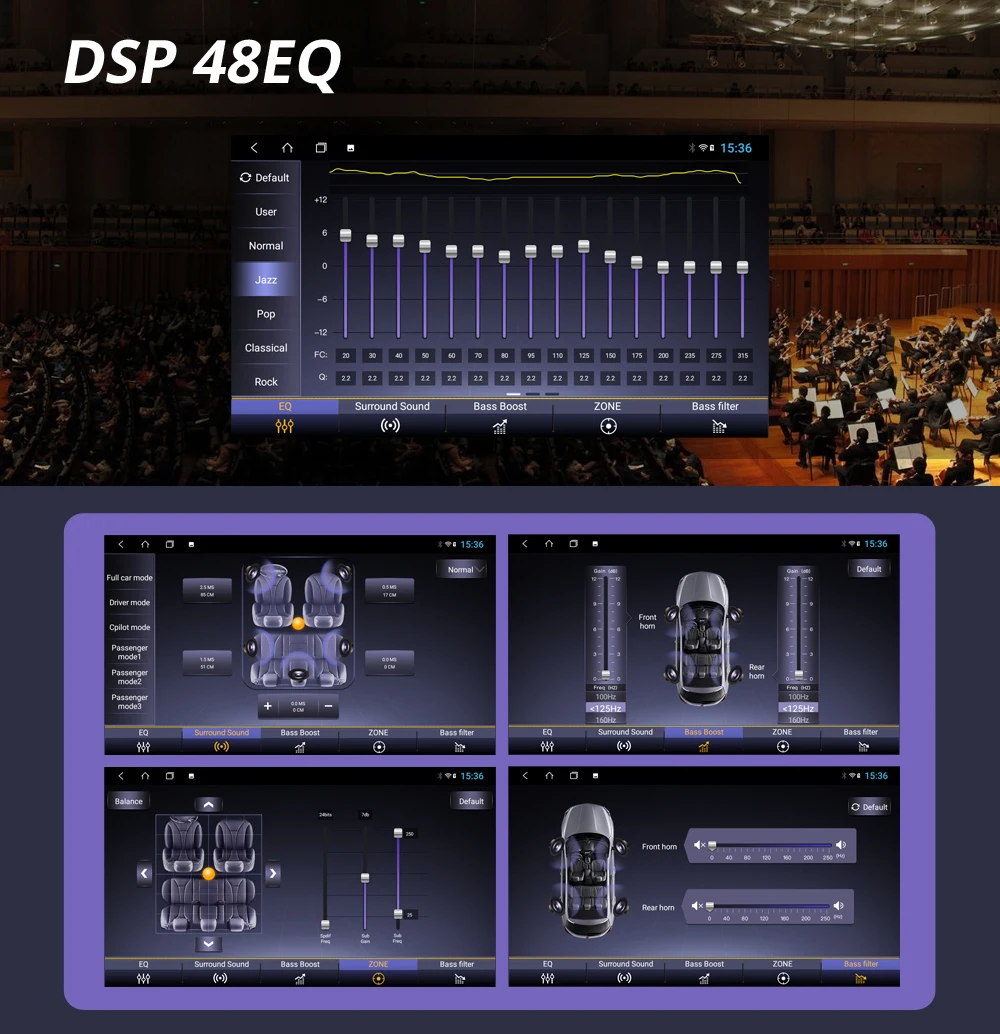 2. Встроенный DSP аудио процессор для Hi-Fi звука, независимая Регулировка передних и задних динамиков, настройка 48EQ дает вам фантастическую музыкуКакова функция встроенного DSP аудиопроцессора? Это цифровой сигнальный процессор, который позволяет вам самостоятельно управлять множеством различных сторон каждого динамика в вашей пользовательской автомобильной аудиосистеме. Вы можете выполнять различные задачи настройки с помощью DSP, такие как управление выравниванием времени для создания отличного центрального изображения, вы можете настроить Кроссоверы для отправки только определенных частот в твитеры, динамики среднего диапазона, средние басовые динамики и сабвуферы, и вы можете управлять эквалайзером, чтобы настроить каждый динамик на целевой уровень отклика.