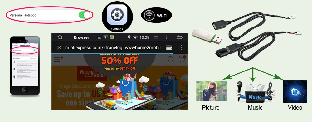 6. Встроенный WIFI (посетите Интернет через телефон hotpot)7. Музыка и видеоплеер (воспроизведение музыки или видео онлайн, с usb-диска или встроенной памяти)