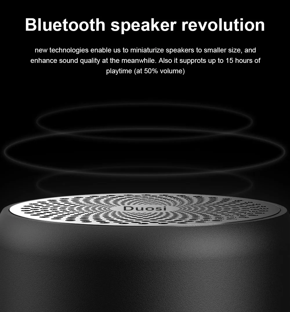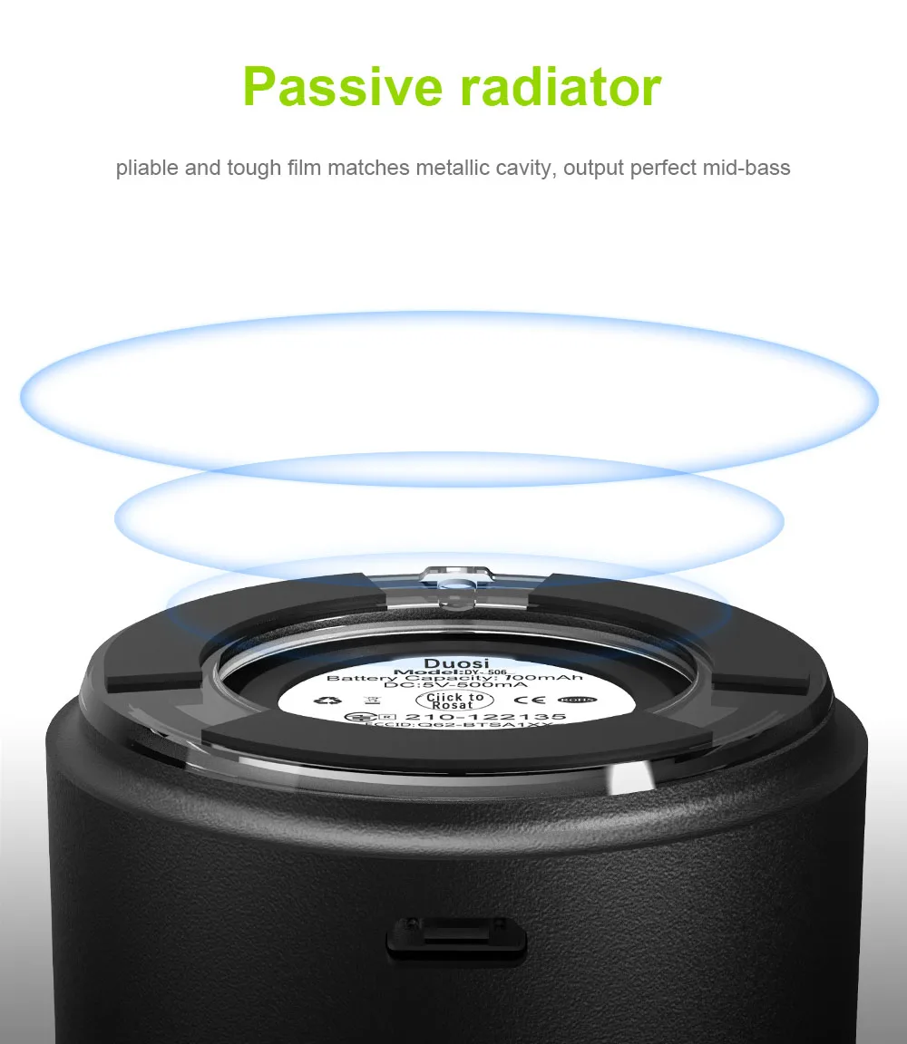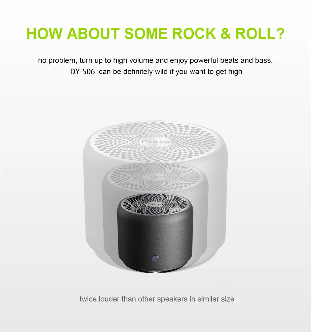 DY-506 мини-динамик удобно маленький, но способен выпускать кристально чистый звук с впечатляющими басами и комнатной громкостью через высокопроизводительный драйвер и пассивный сабвуфер. Маленькие, но такие мощные bluetooth-колонки. Беспроводная потоковая музыка или интернет-радио, такие как Pandora и Spotify со смартфона, iPhone или другого аудиоустройства с Bluetooth.