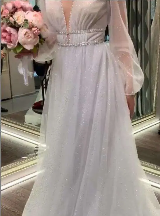 Платье Свадебное блестящее ТРАПЕЦИЕВИДНОЕ с пышными рукавами и V-образным вырезом