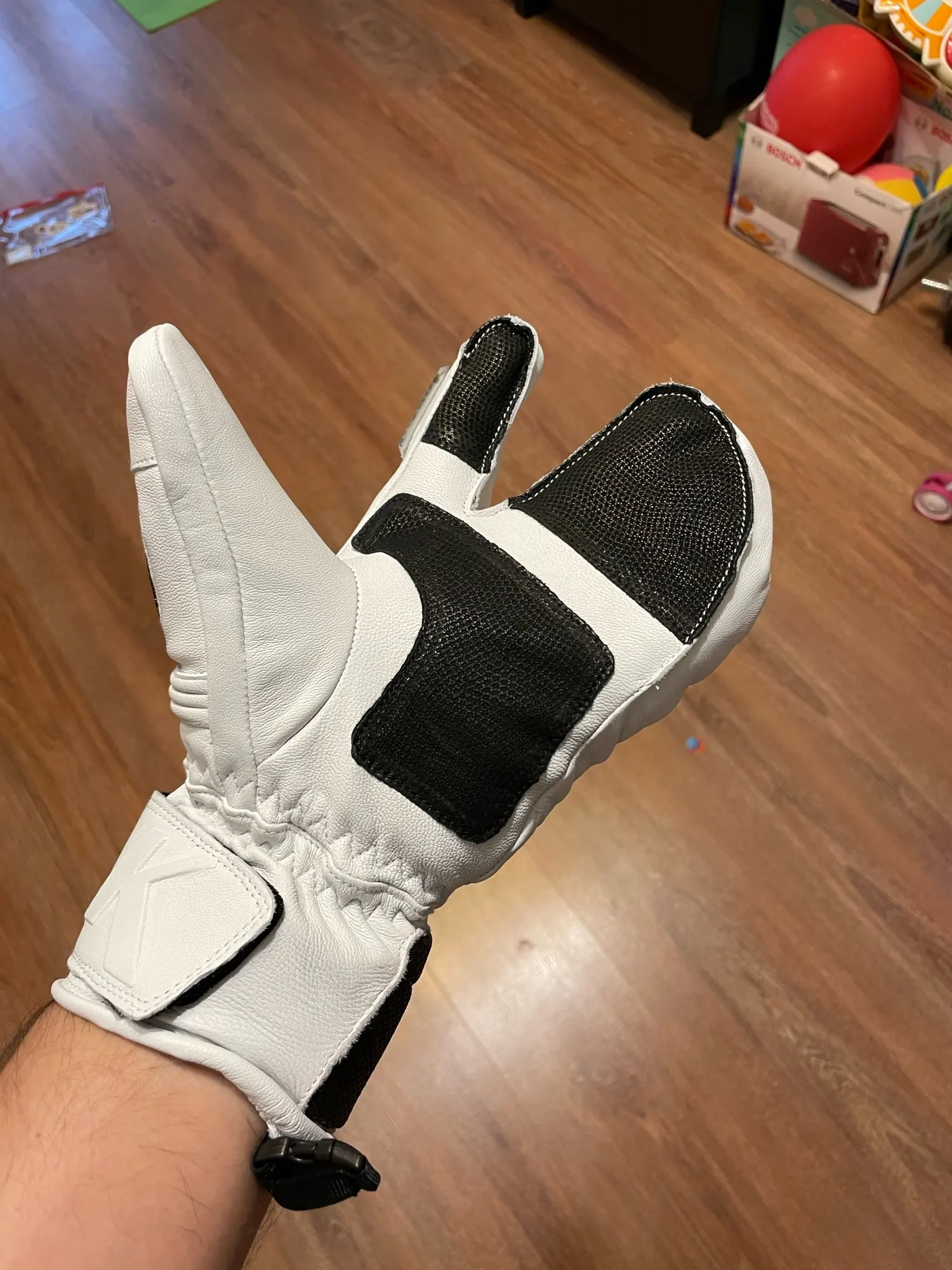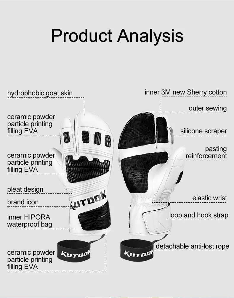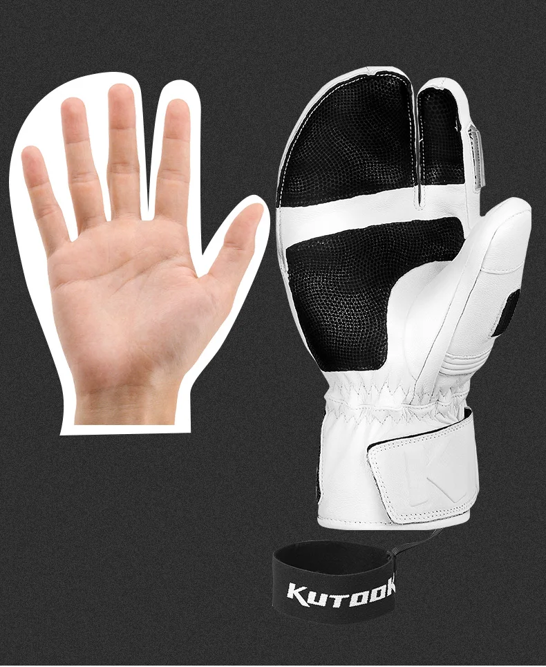 Название: перчатки для катания на лыжах с тремя пальцамиРежим: GS515Цвет: белый, черныйМатериал: поверхность из козьей кожи + 3 М изоляция Thinsulate/изоляторОсобенности:1. Гидрофобный износостойкий материал из козьей кожи2. 3 м Thinsulate изоляция/изолятор, светильник, теплый3. Кожа ладони для укрепления противоскользящей и износостойкой4. Печать керамических порошковых частиц на важных стыках задней ладони + защита EVA