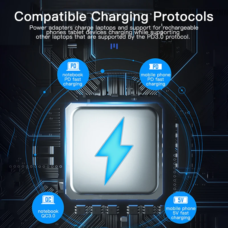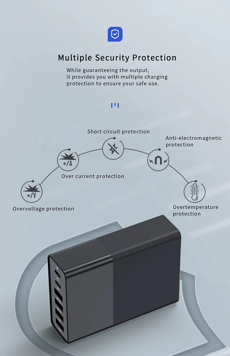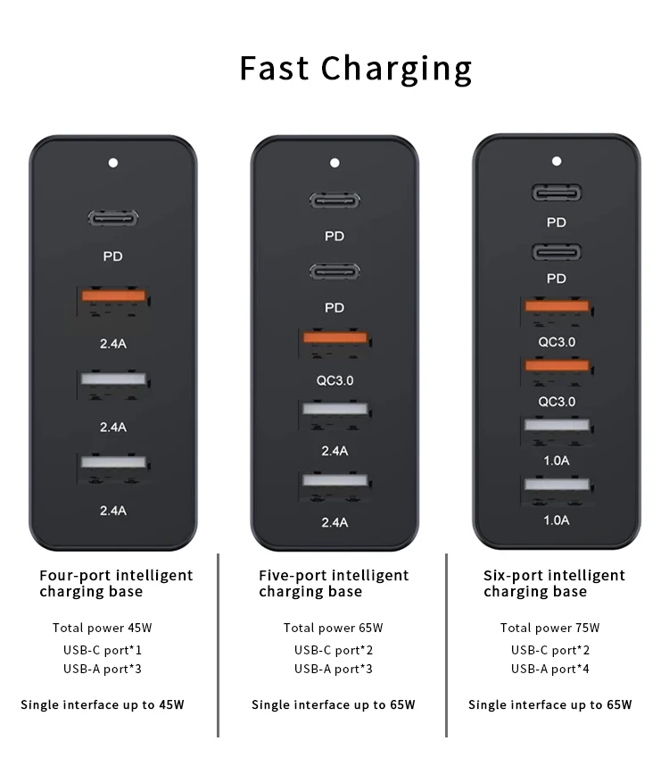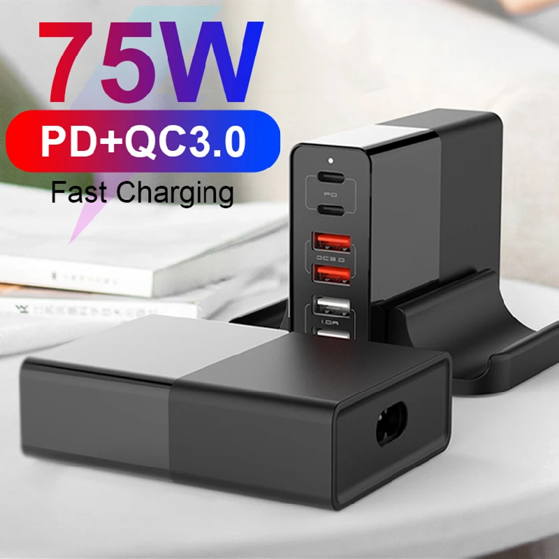 Сверхмощный выход, заправляет все устройства вместеВысокая мощность 75 ВтДвойной PD3.0, двойной QC3.06 портов USBУниверсальная совместимостьМногослойная защита