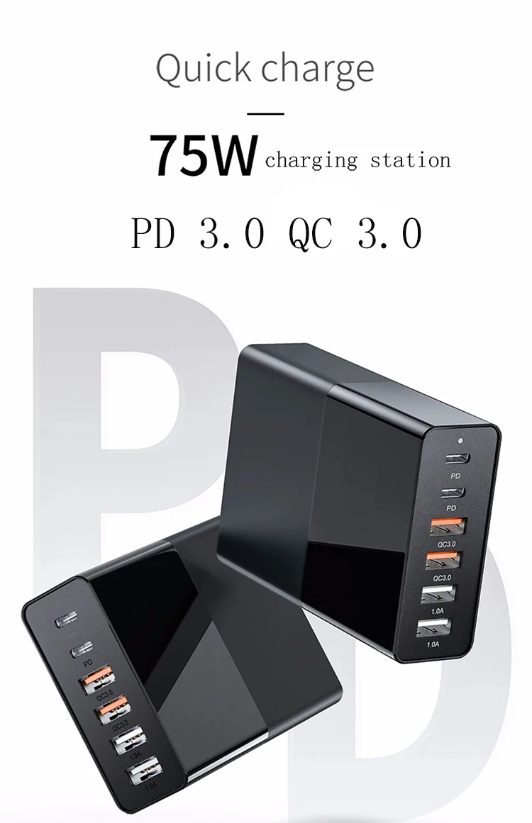 Зарядное устройство с 6 USB-портами, 75 Вт, QC 3,0