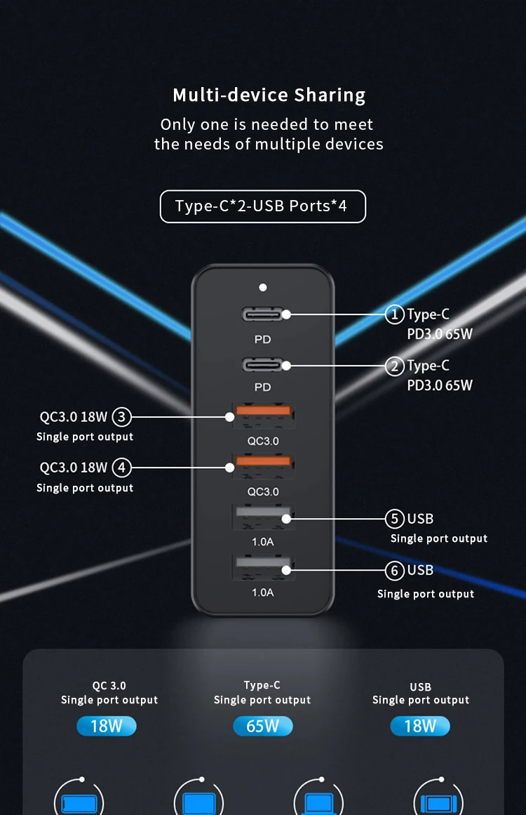 Совместное использование нескольких устройствТип c PD3.0 65 ВтQC3.0 18 ВтUSB A