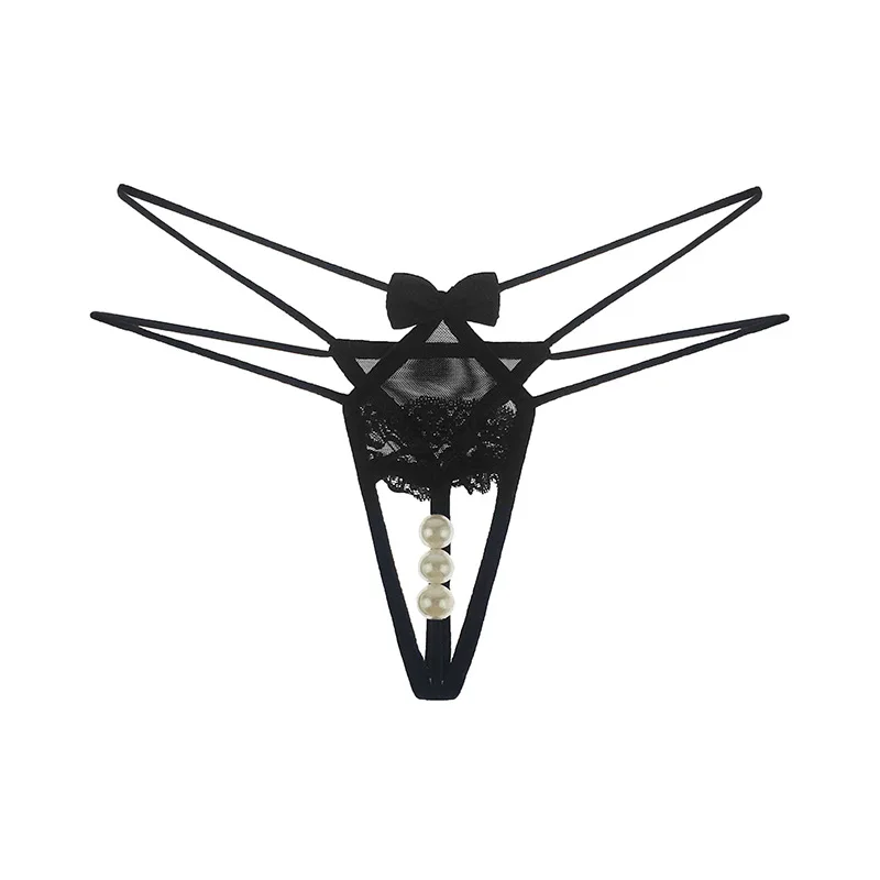 Эротическое нижнее белье, трусики, сексуальные кружевные трусики с вышивкой жемчугом и открытой промежностью, стринги с прозрачным бантом, стринги с Т-образной спинкой