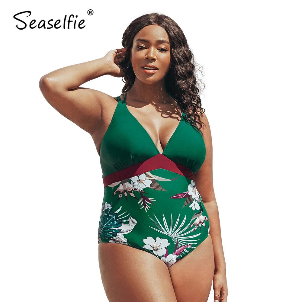 SEASELFIE размера плюс зеленый и цветочный сплошной купальник женский большой размер сексуальный Монокини с v-образным вырезом купальный костюм 2022 пляжный купальник
