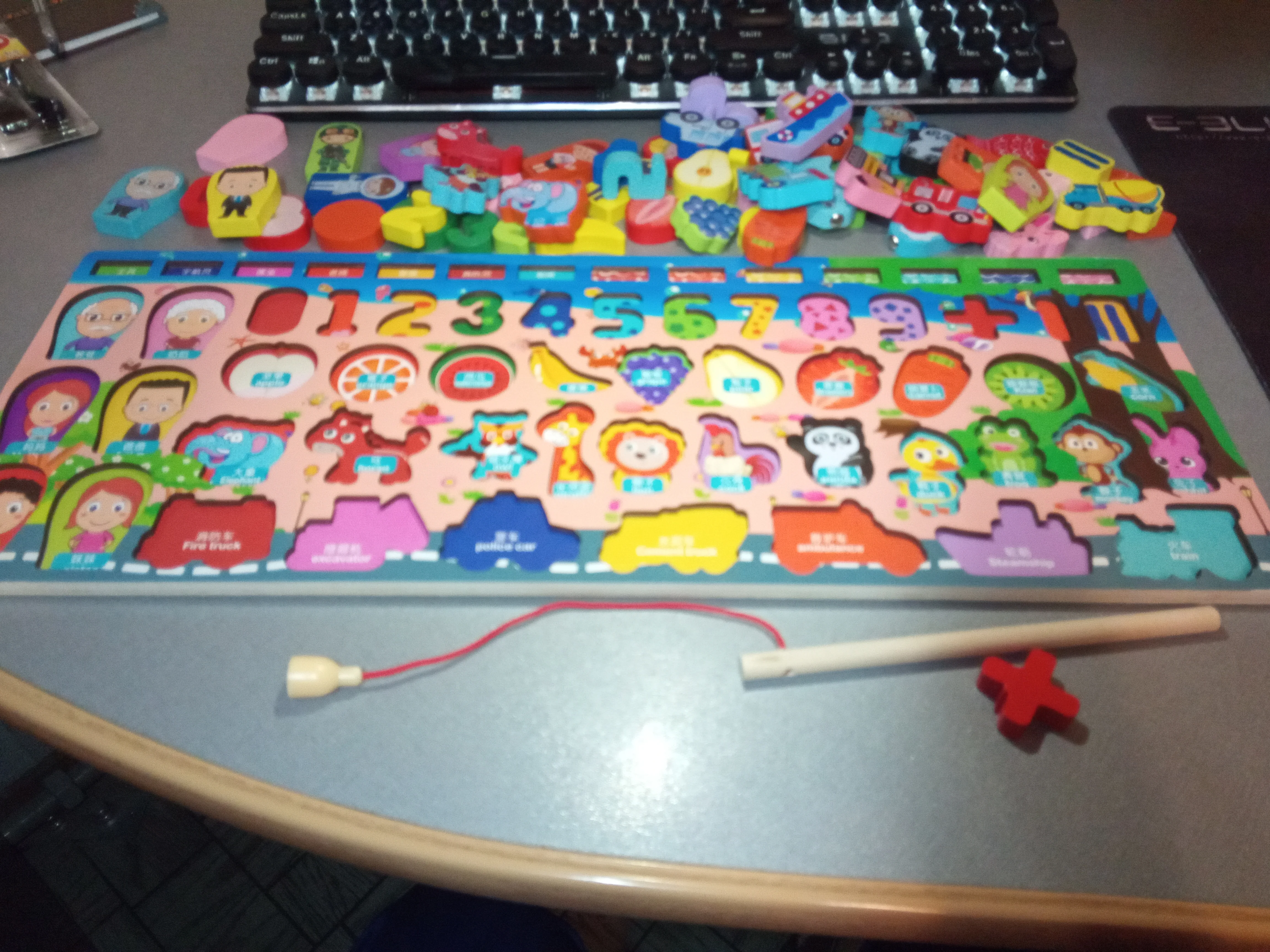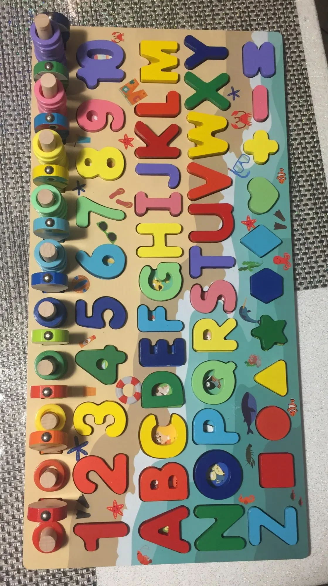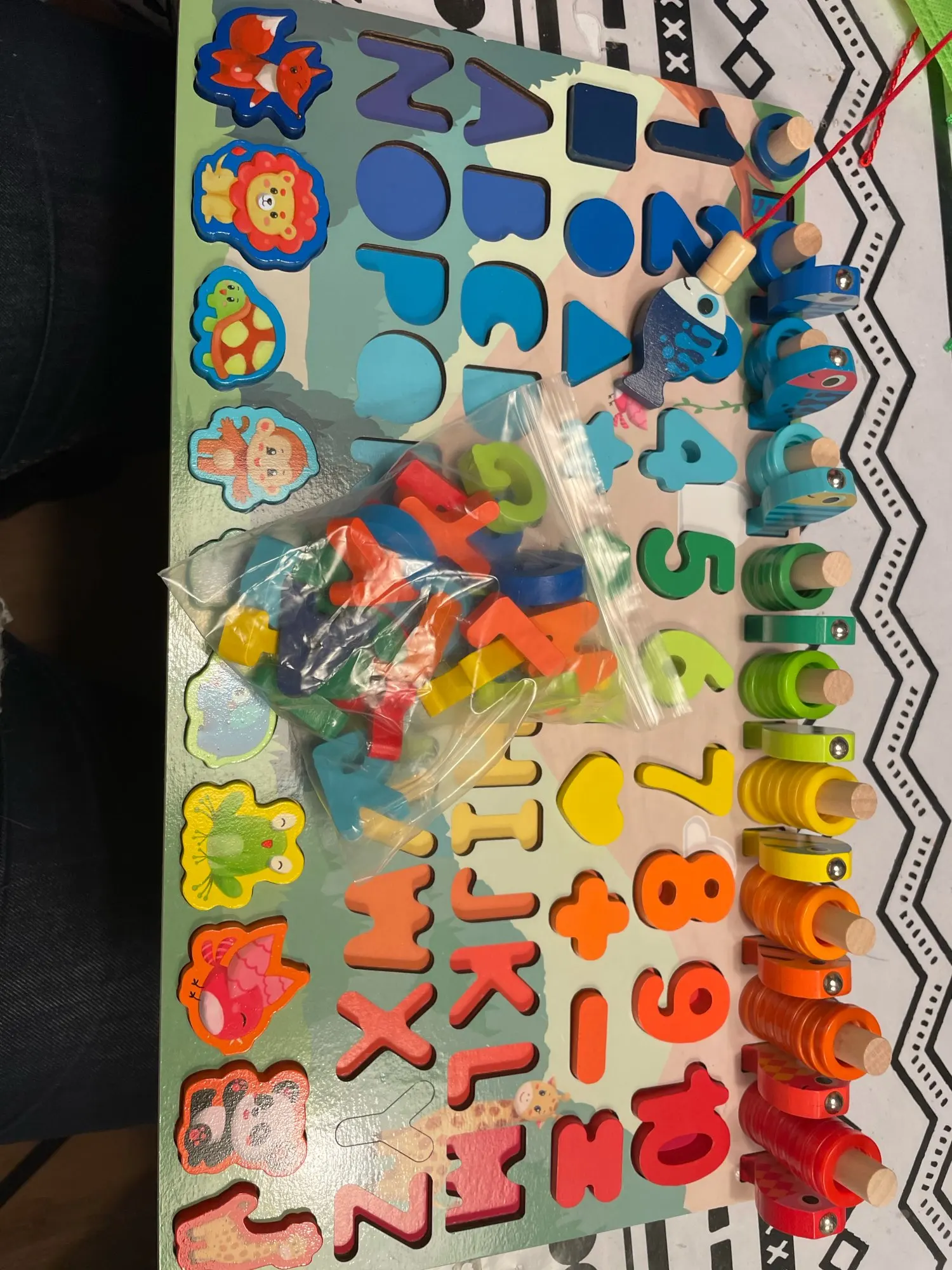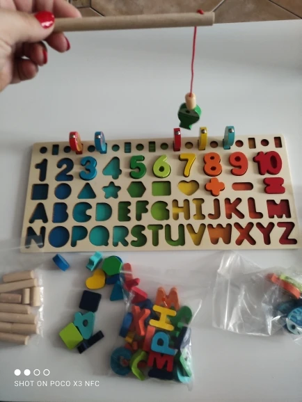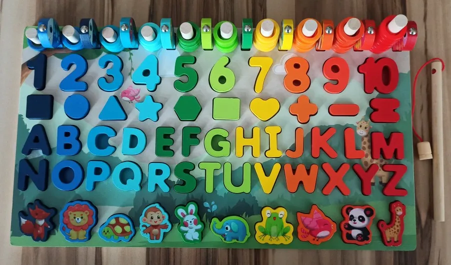 Отличная игрушка. Мой 2-летний мальчик немного слишком мал для букв, но животные, формы, цифры, рыбалка и сортировка колец-отличная работа. Сегодня он хотел омить завтраки, потому что хотел играть. Качество игрушки хорошее.