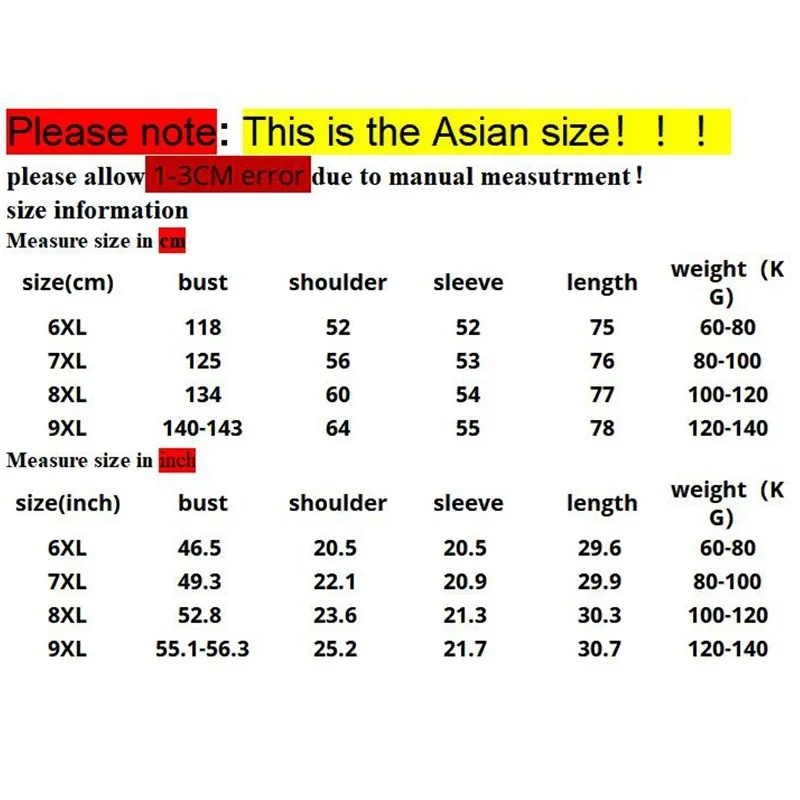 Размер (дюймы) Бюст Плечо Рукав Длина Вес (кг) 6XL 46,5 20,5 20,5 29,6 60-80 7XL 49,3 22,1 20,9 29,9 80-100 8XL 52,8 23,6 21,3 30,3 100-120 9XL 55,16-56,342 25,2 21,7 30,7 120-140