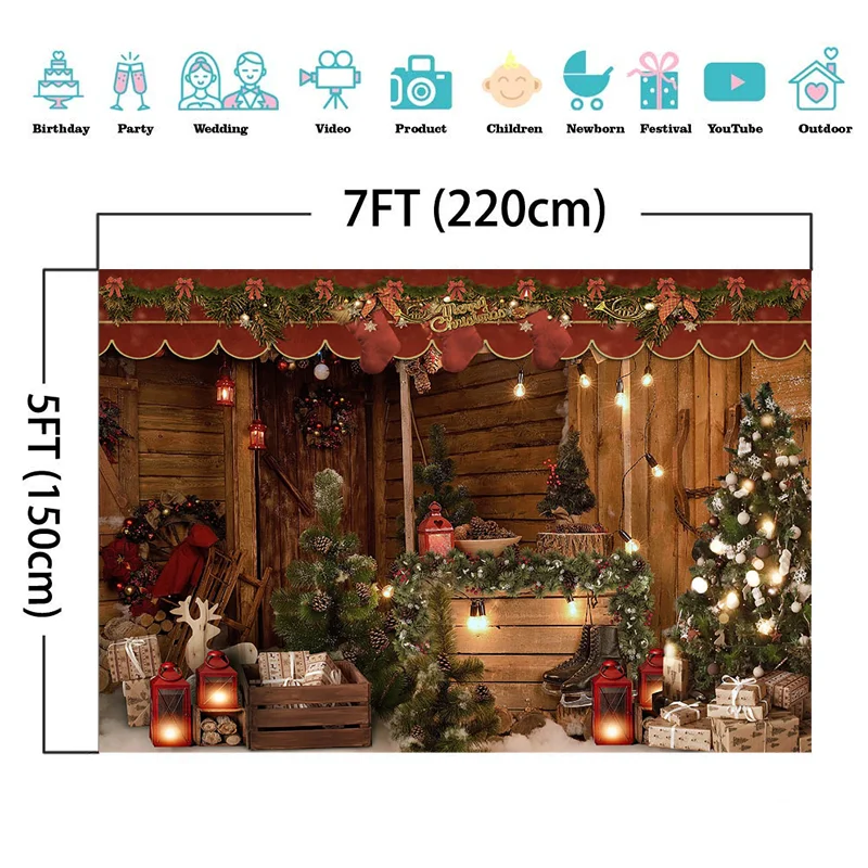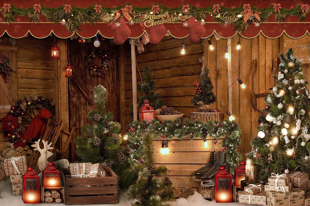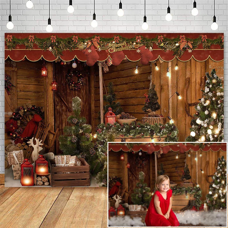 Фон для студийной фотосъемки детей с изображением рождественской елки деревянного дома