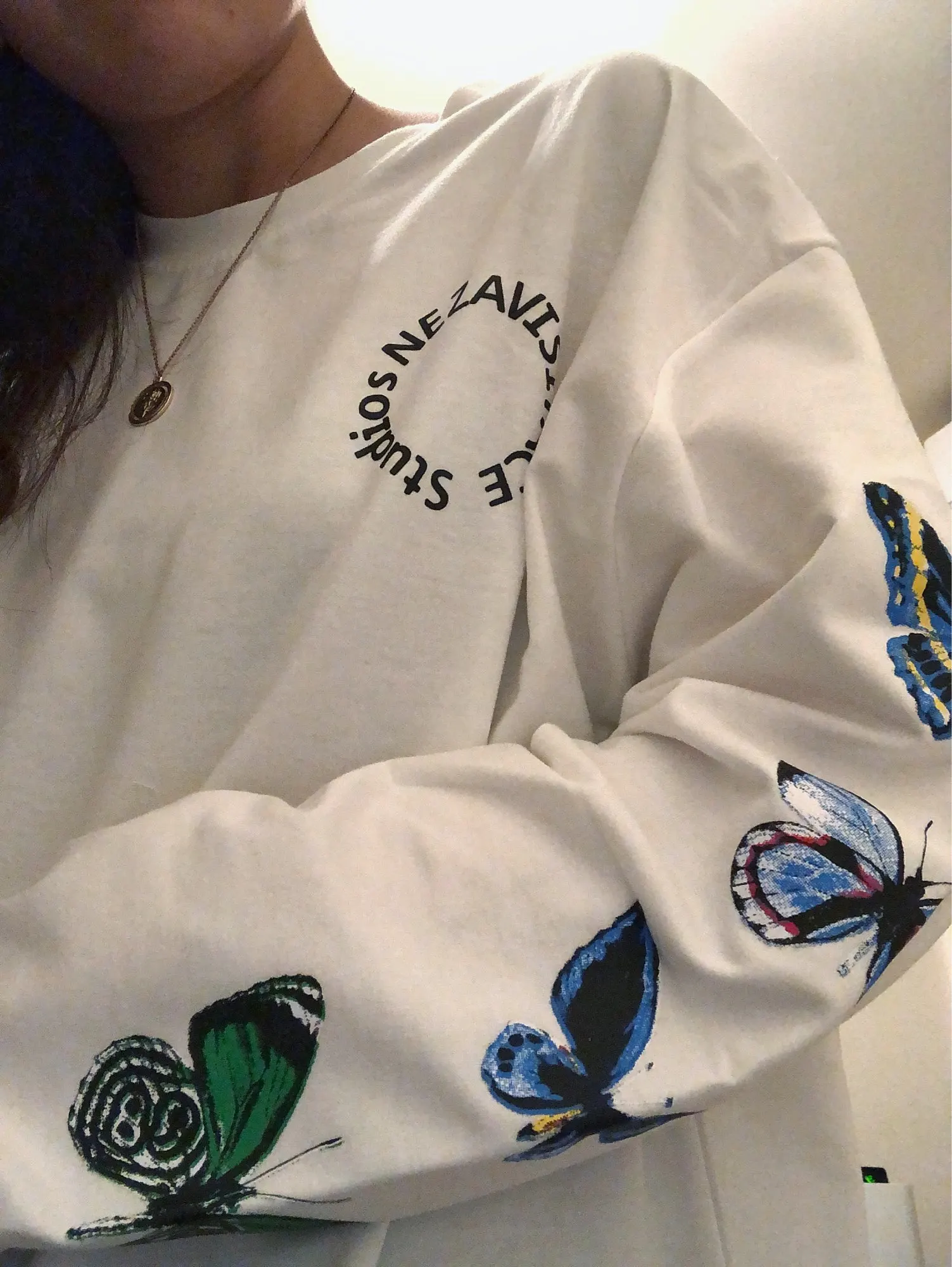 Специально брала ХХЛ, чтобы кофта была оверсайз, как на фотографиях, но как видно по фото она была максимум М(?) и принт с бабочками кажется каким-то высветленным. В общем, и материал не тот, что на фото и рисунок. Хотя бы без пятен пришла кофта