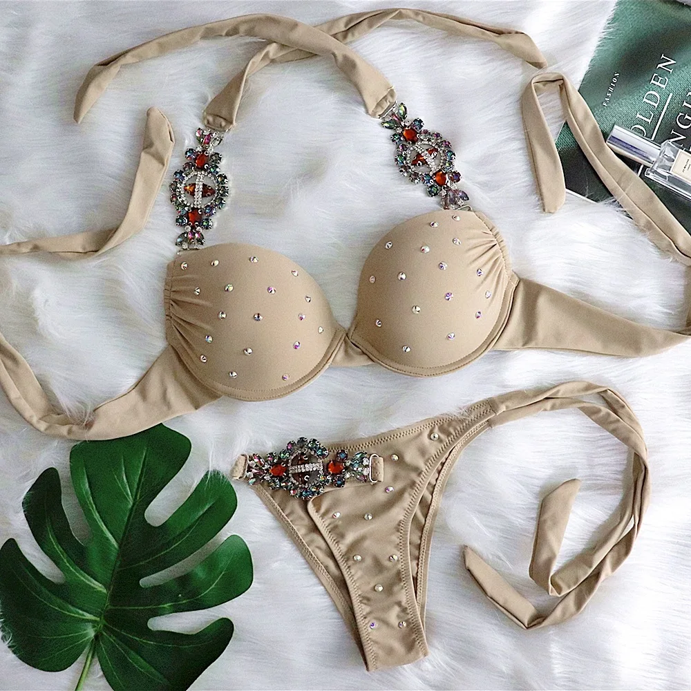 Женский бразильский купальник-бикини, с чашкой пуш-ап, со стразами, с лямкой на шее, 2020